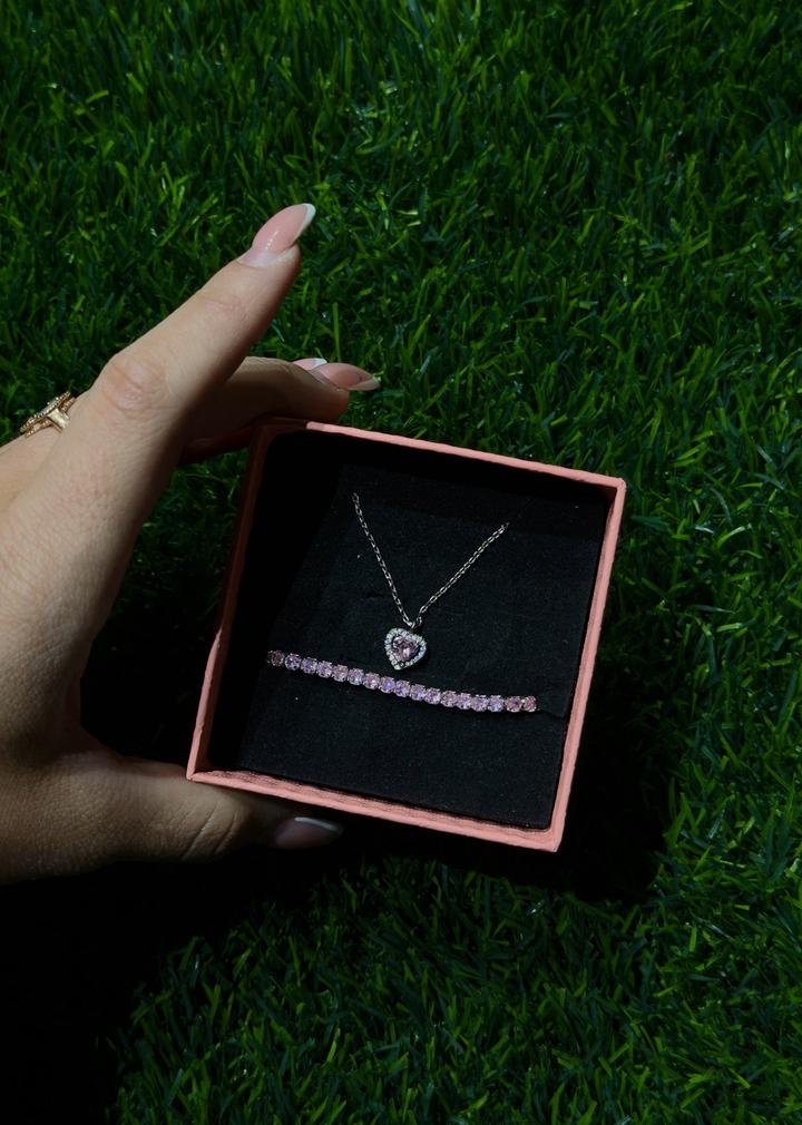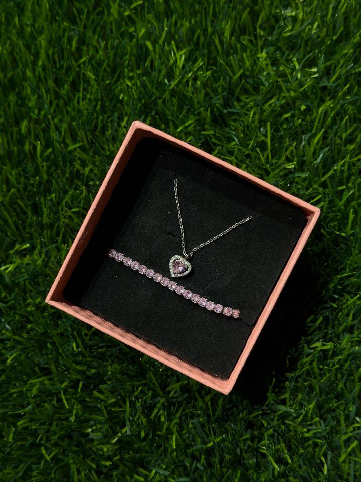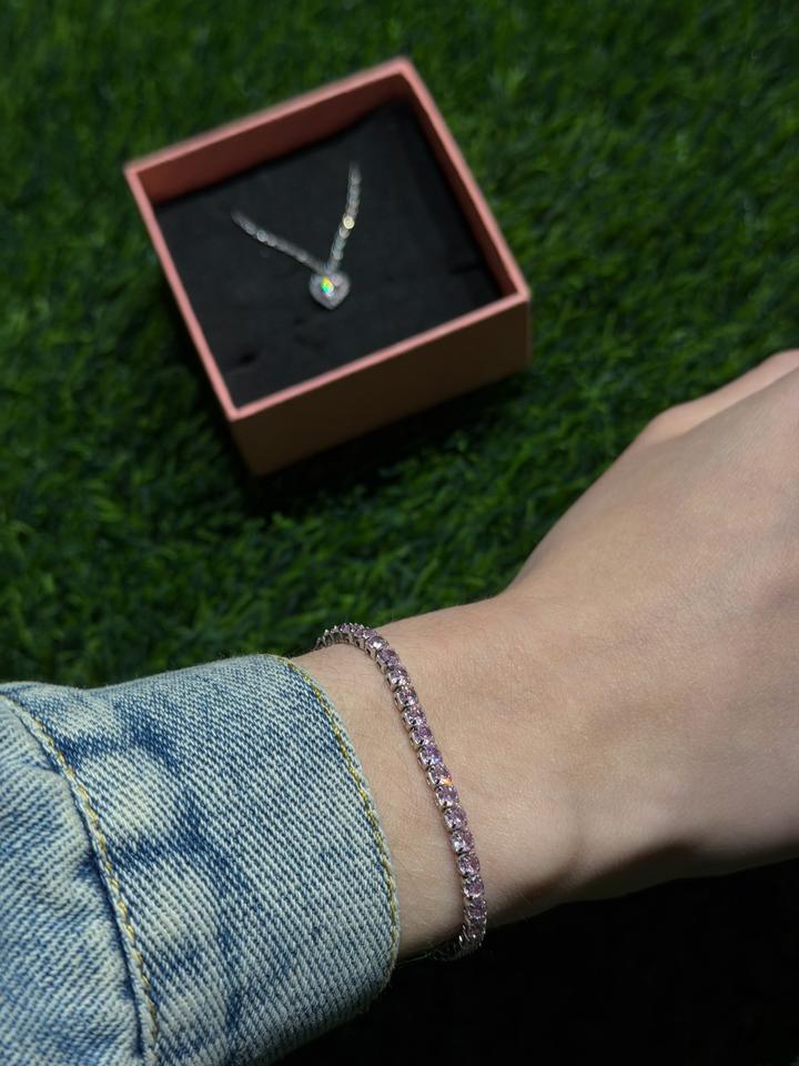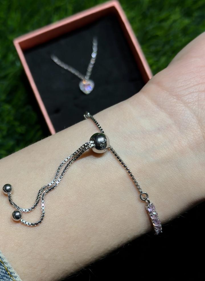 Нежный браслет-дорожка с розовыми камнями и подвеска в форме розового сердца- элегантное дополнение к любому образу. Серебро 925 пробы Артикул: 593290