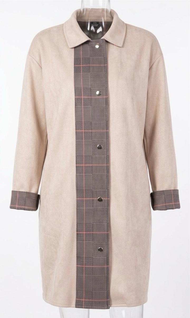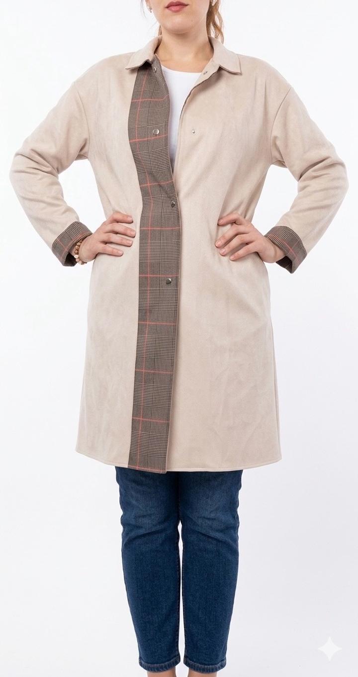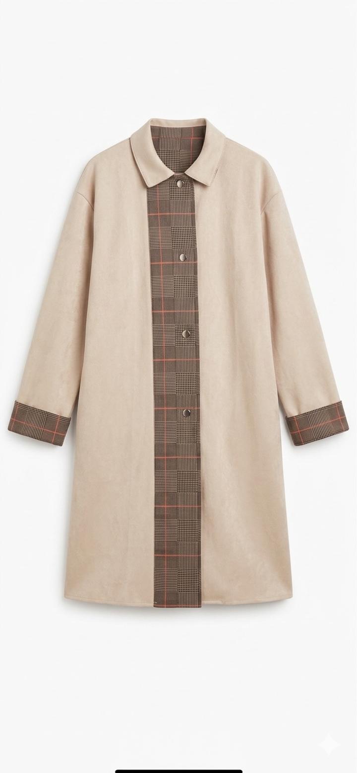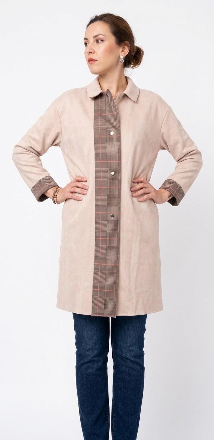 Легкое пальто/тренч. Модель выполнена из мягкой ткани, напоминающей искусственную замшу (furred suede effect), что придает образу мягкость, уют и дорогой вид. Ткань приятна на ощупь и красиво драпируется. Тренч Застегивается на матовые серебристые кнопки. Воротник: Лаконичный отложной воротник. Свободный крой (оверсайз), который позволяет носить тренч как с легкими платьями, так и с объемными свитерами.Базовая ткань теплого бежевого оттенка с деталями в классическую шотландскую клетку. 46-48-50 Артикул: 593303