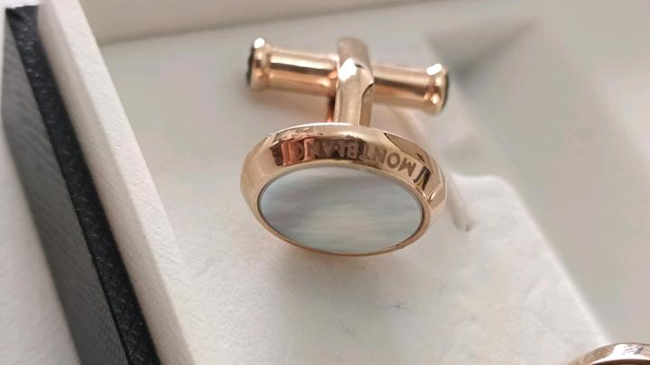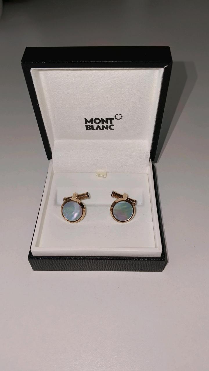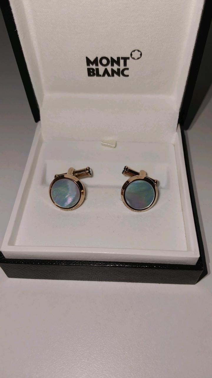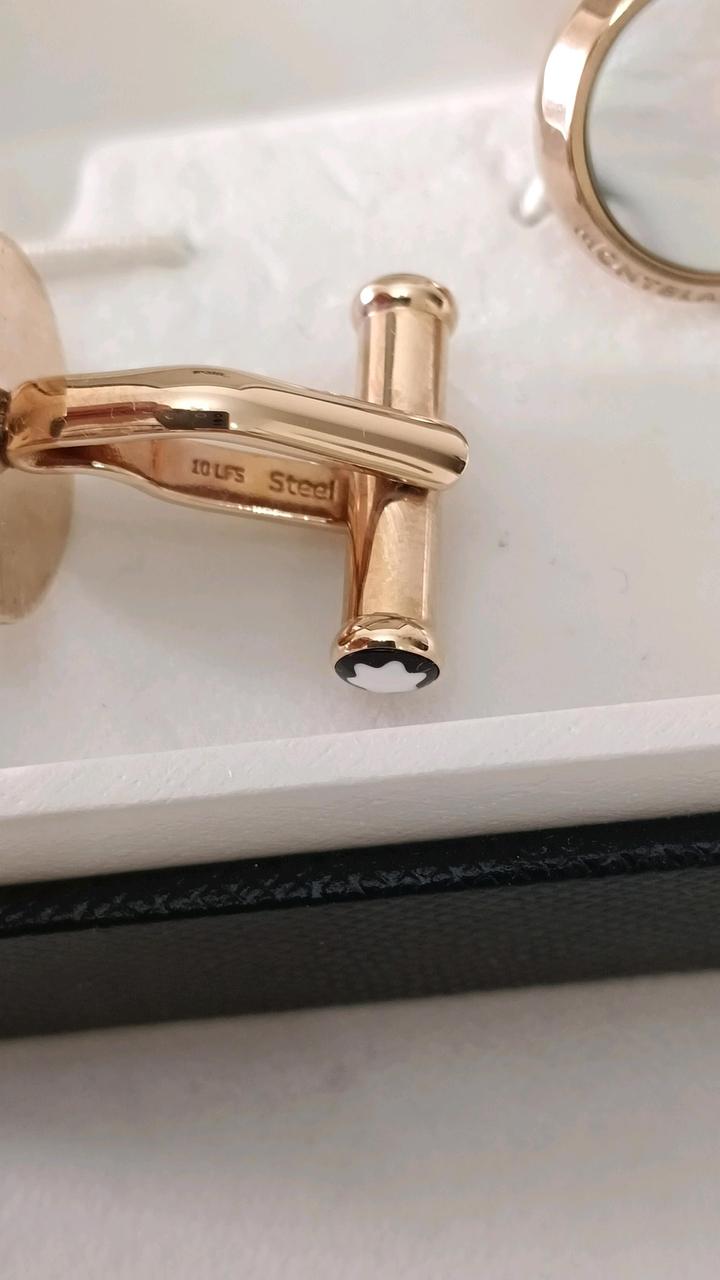 Мужские запонки Meisterstuck Mont Blanc классической круглой формы из нержавеющей стали с PVD-покрытием цвета розового золота и перламутровыми вставками. Артикул: 593346