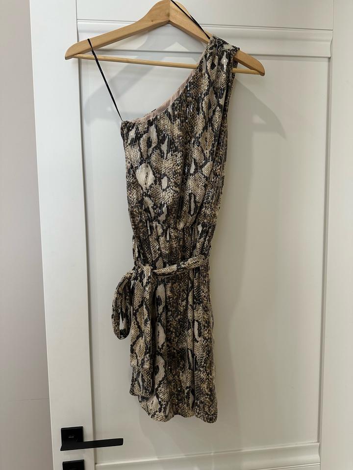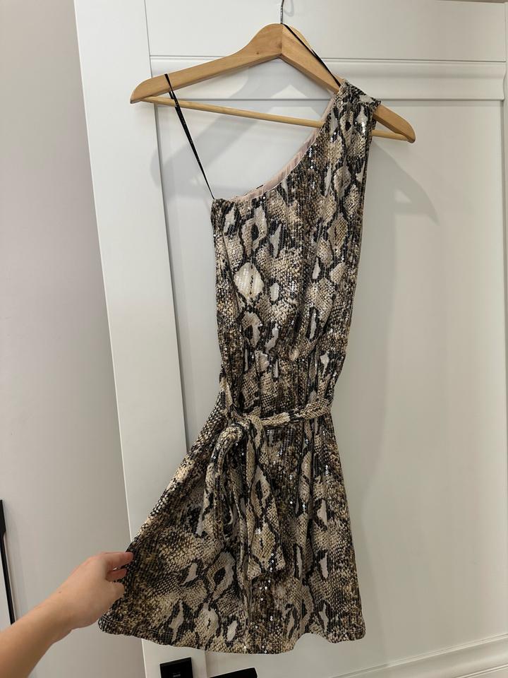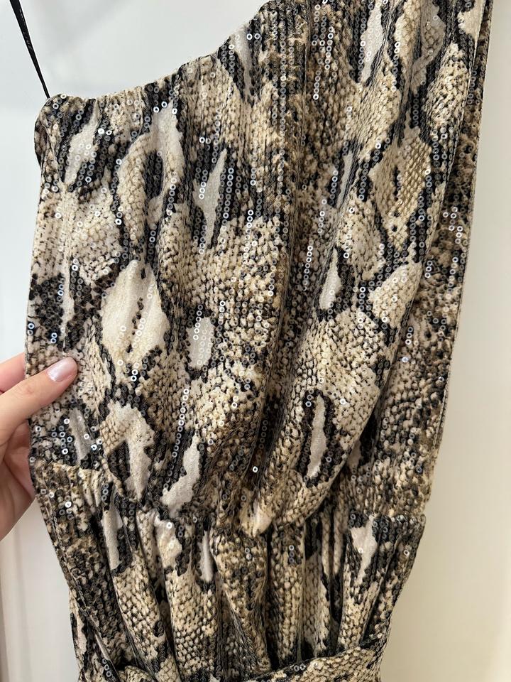 Платье на одно плечо из пайеток с поясом Очень хорошего качества, все пайетки пришиты и не сыпятся, создают эффект змеиной кожи На бирке XS, подойдет и на S Без следов носки Надевала 2 раза Артикул: 593369