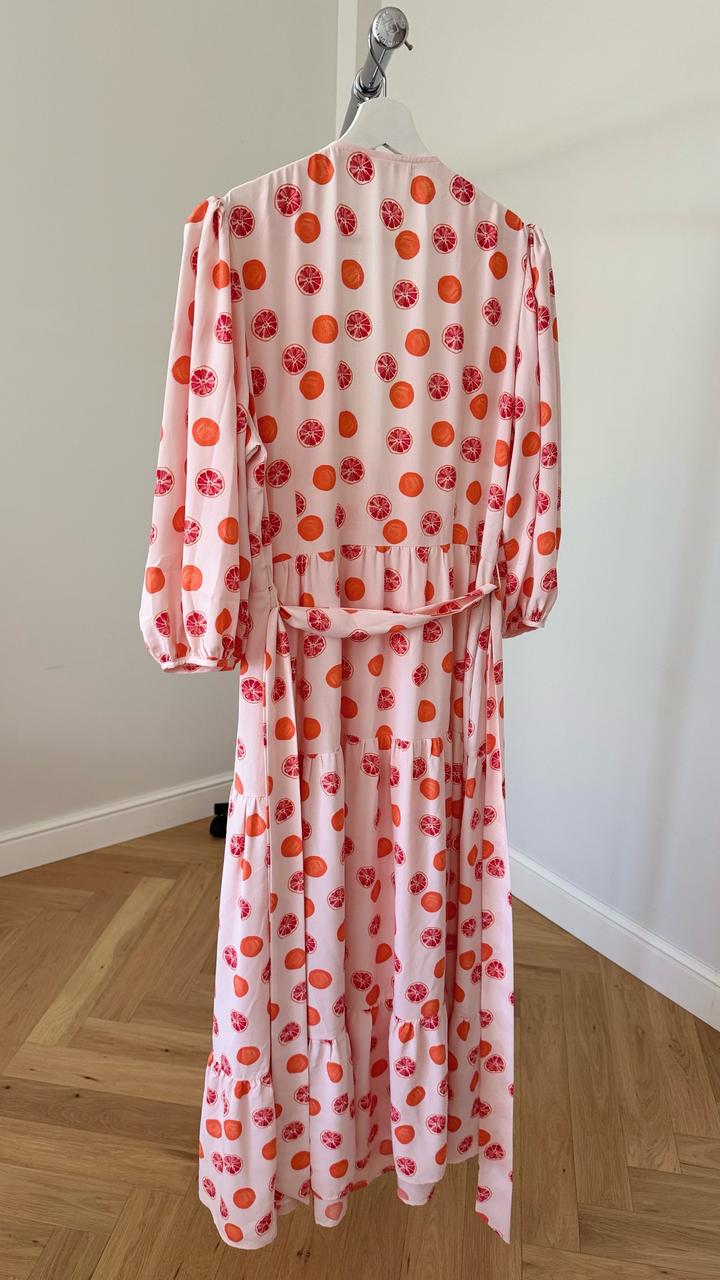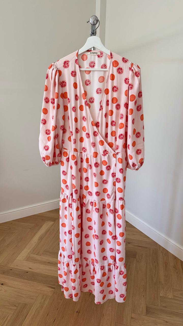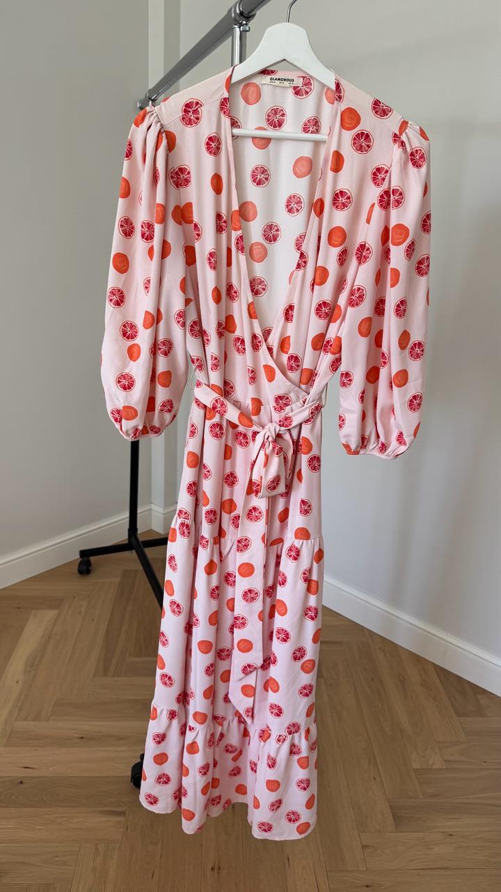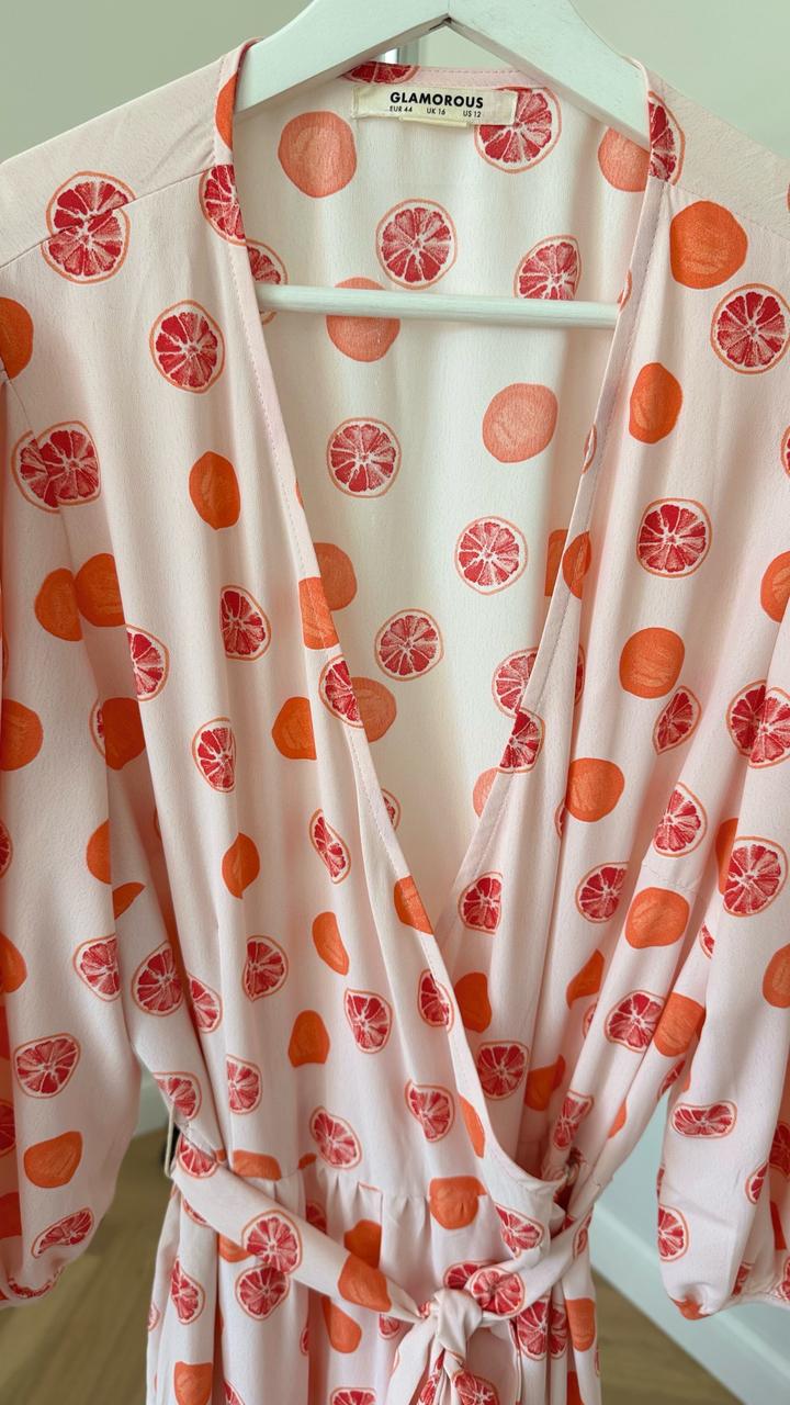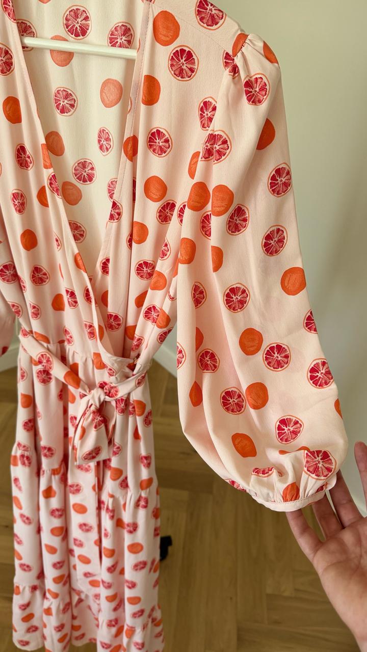 Вкусное, сочное, летнее платье. Покупала на asos. Для летних фестивалец с бокалом апероля- самое то! Платье на запах подойдет от M до XXL. Полиестер, на ощупь очень приятная ткань, не мнется. Последняя фото это ИИ так фон увидел) Артикул: 593391