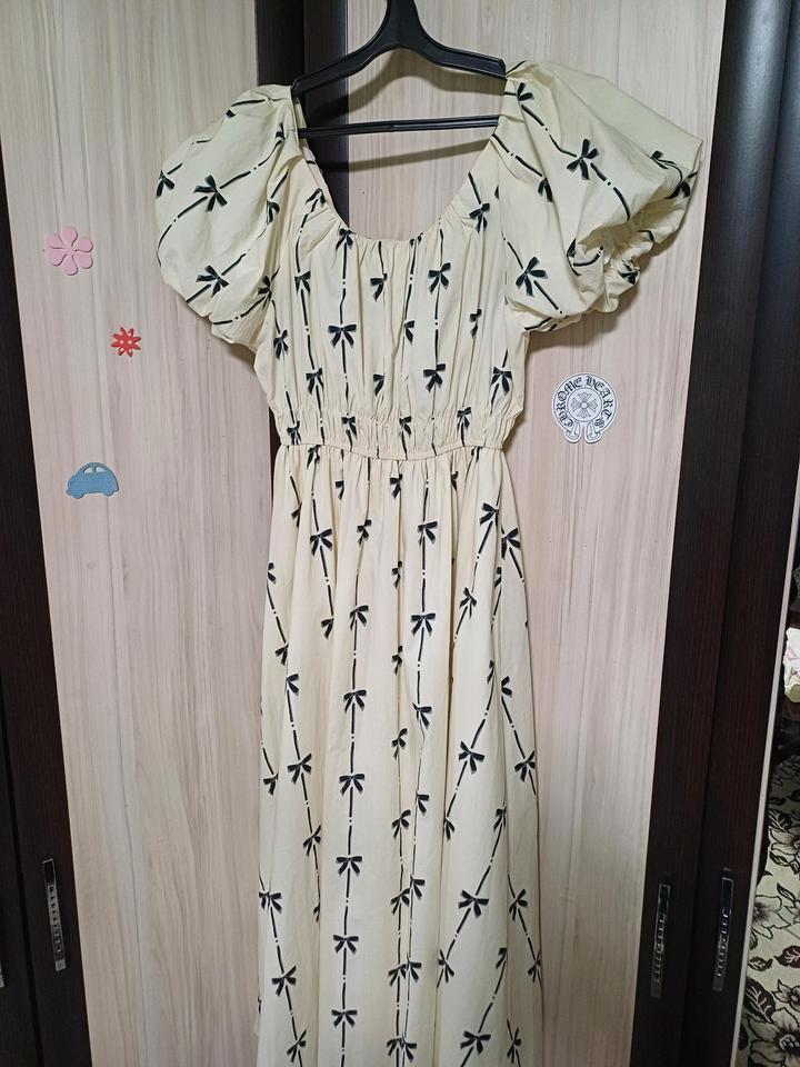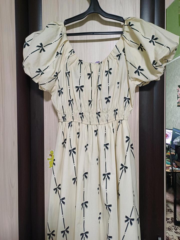 Бежевое платье с бантиками Размер примерно L Резинка на талии На рост 1+7### ### ## ##во время примерки в магазине, после чего просто висело в шкафу. Продаю, так как без дела висит в шкафу. Ткань лёгкая, есть подъюбник Артикул: 593607