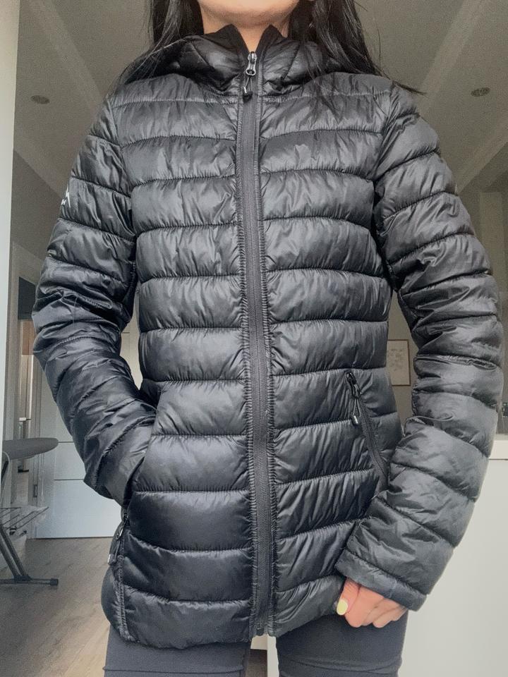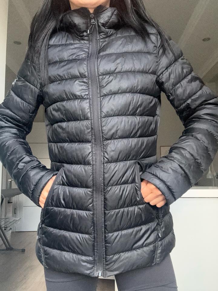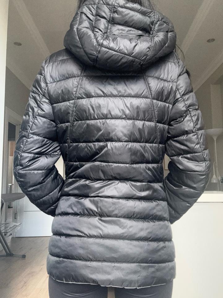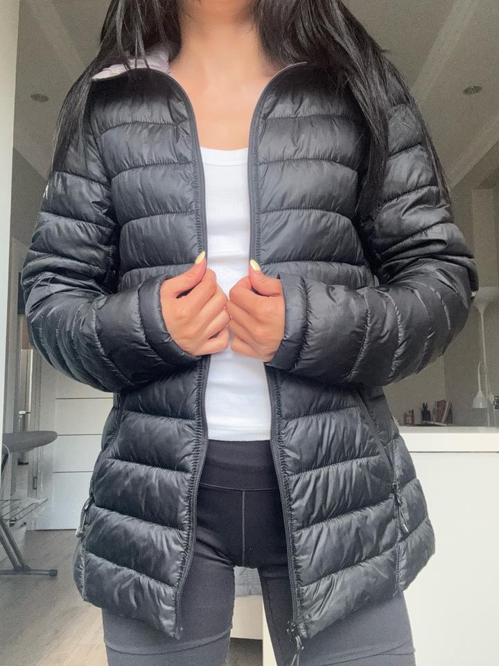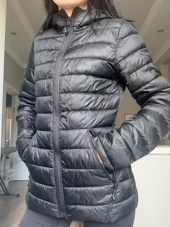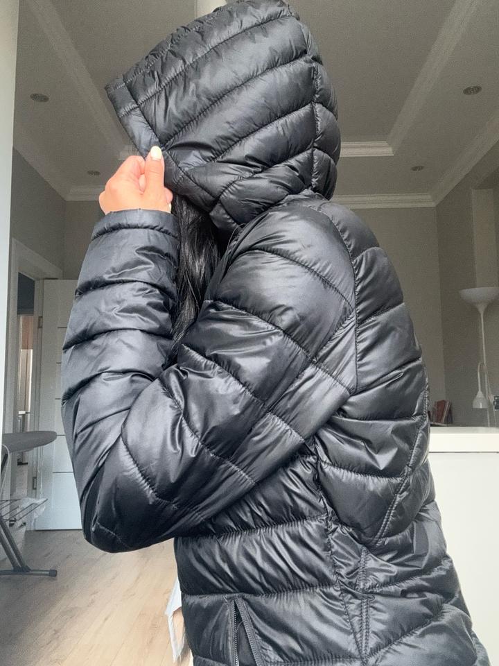 Стёганая куртка в чёрном цвете с горизонтальной простёжкой, приталенный крой, застёжка на молнии, воротник-стойка и капюшон, боковые карманы на молнии — лёгкая и компактная, подходит на прохладную погоду (весна/осень). В отличном состоянии. Артикул: 593715