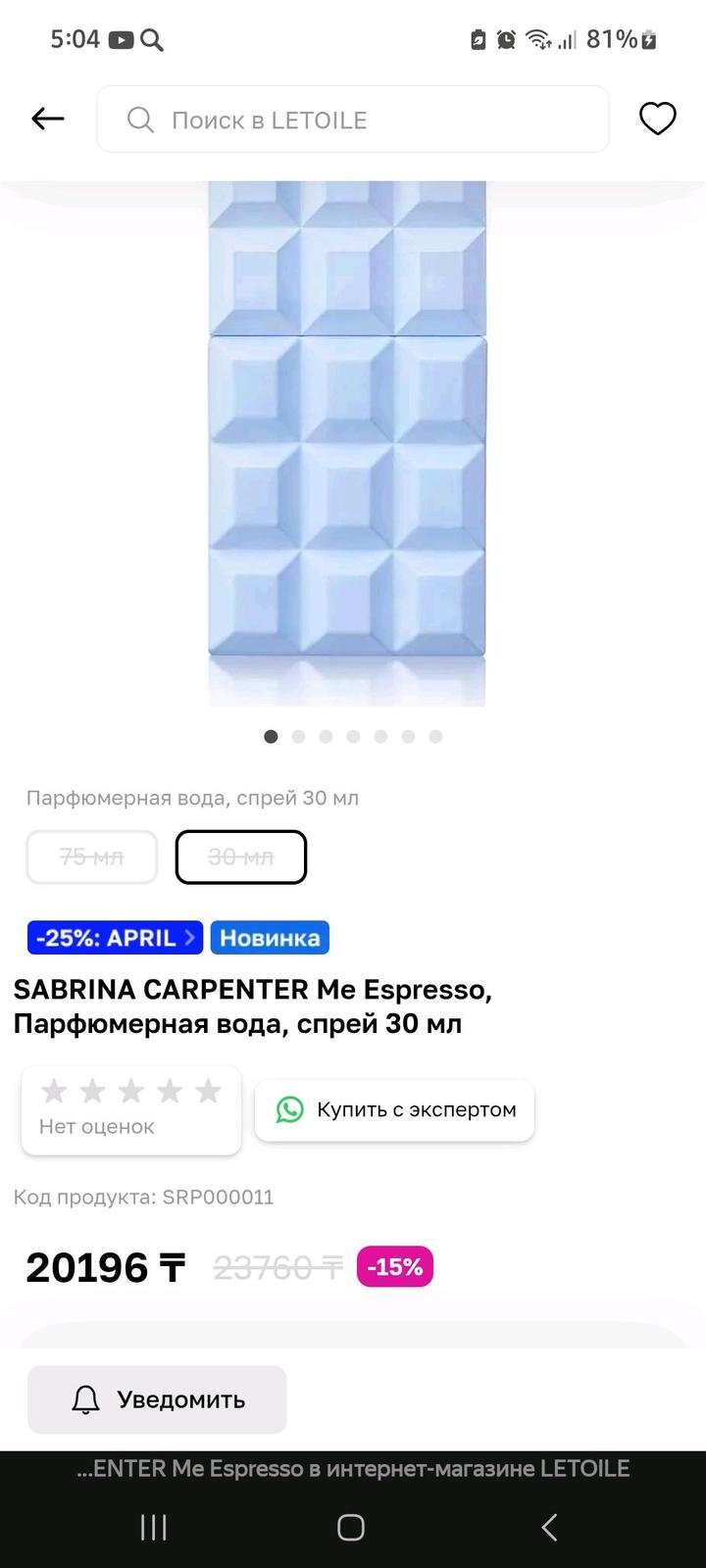 Продам новую парфюмерную воду от Сабрины Карпентер, аромат Me Espresso. Оригинал, покупался в Летуаль. Верхние ноты бобы эспрессо, какао-порошок Ноты сердца глазурь, амбра, сливки Базовые ноты жасмин, ванильная орхидея, бискотти Артикул: 593751