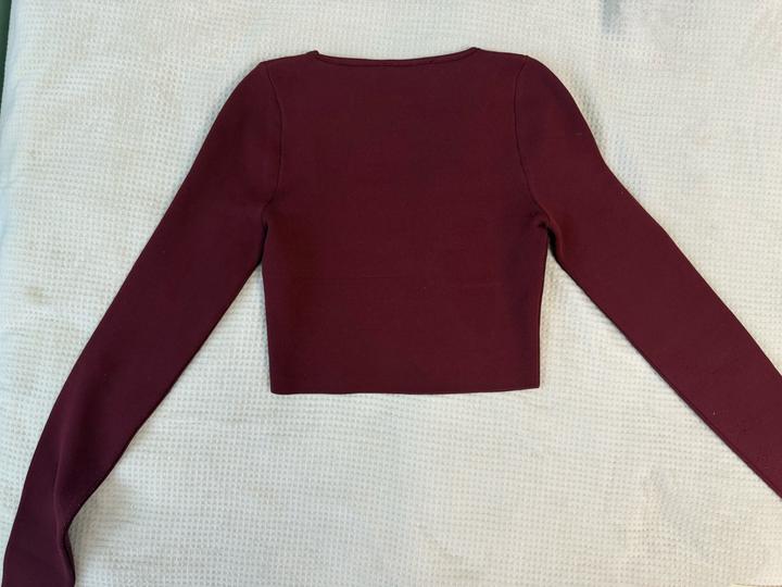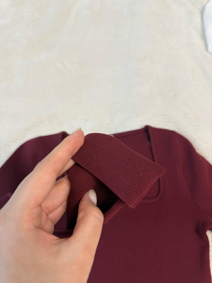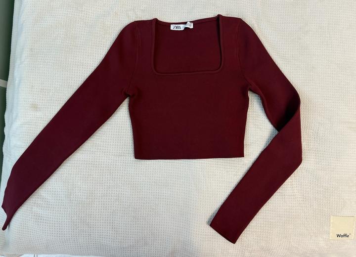Бордовый кроп-лонгслив Zara с квадратным вырезом, приталенный, укороченный. Материал трикотаж в мелкий рубчик. Артикул: 593776