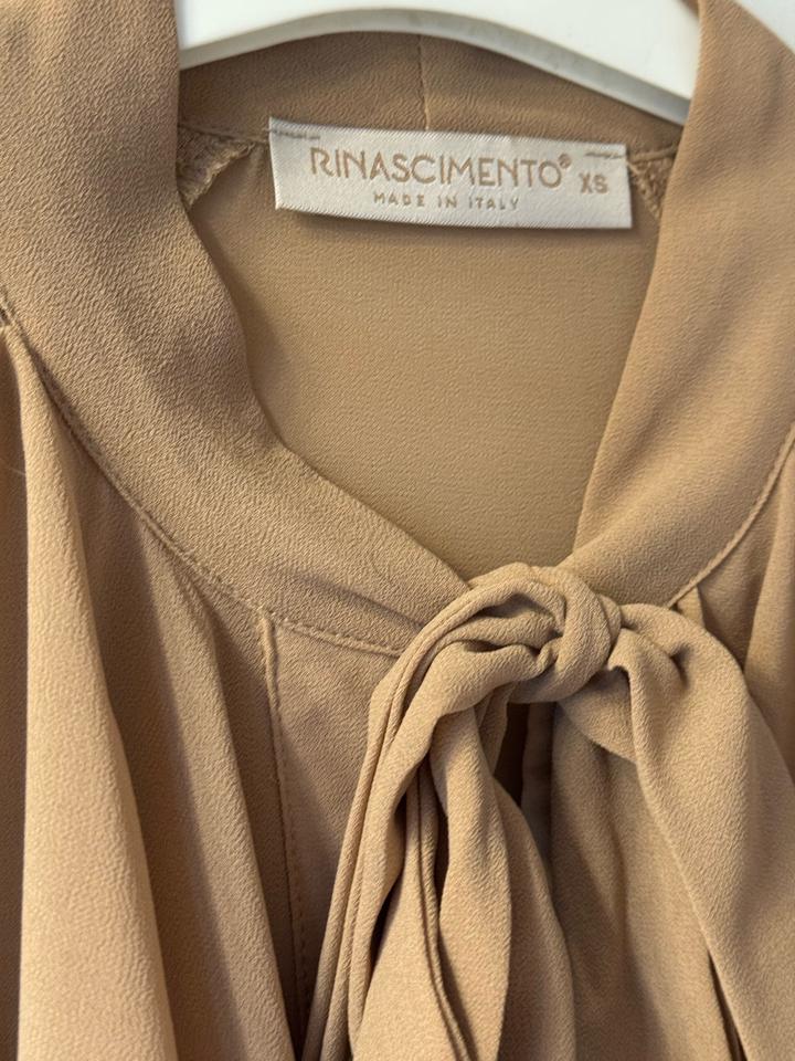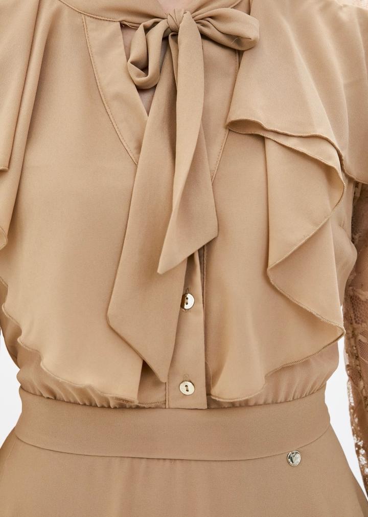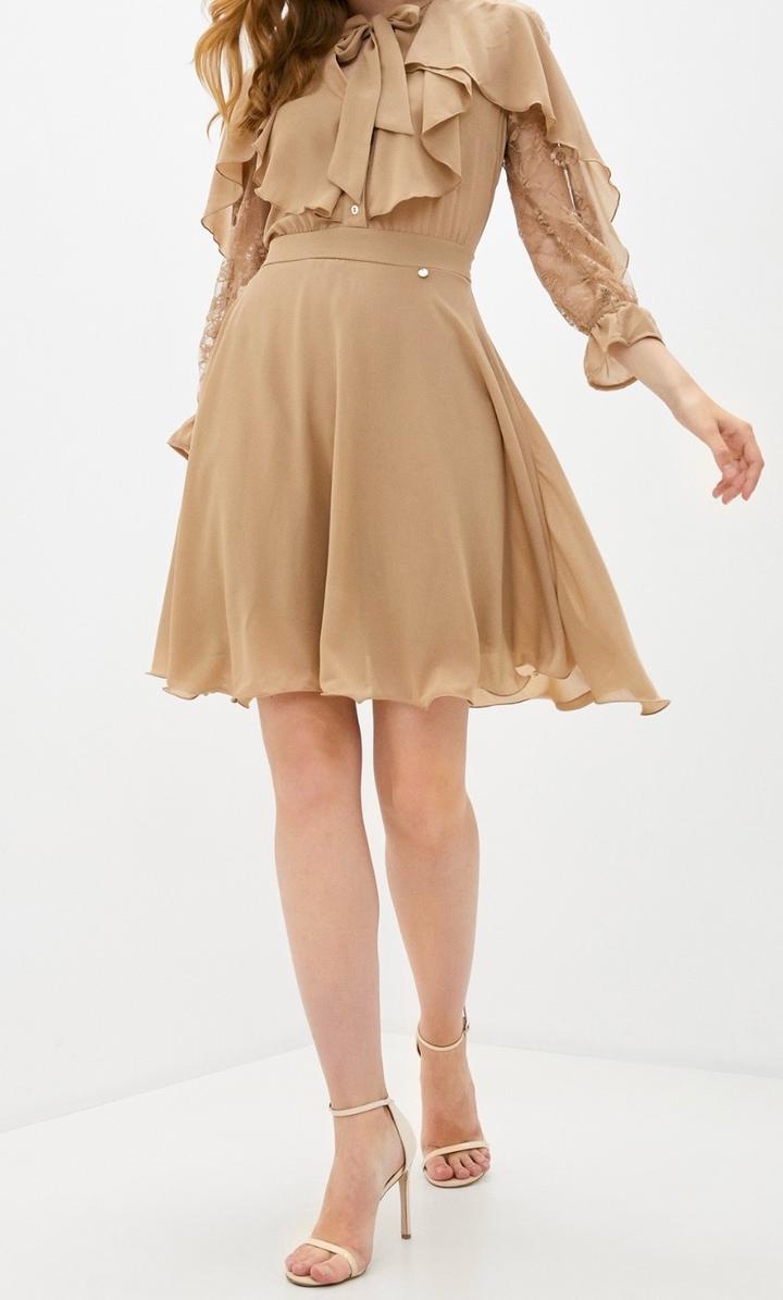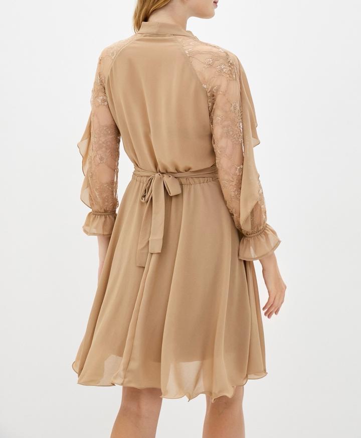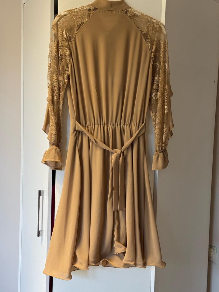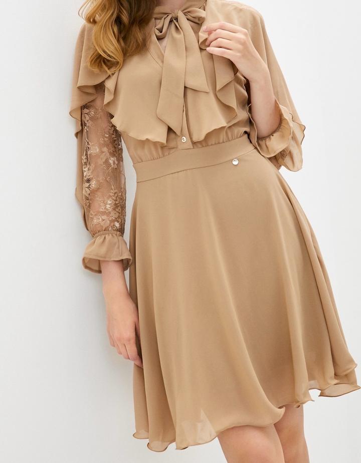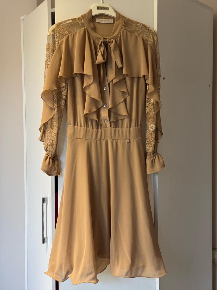Бежевое платье с кружевными рукавами и рюшами. Воротник завязывающийся на бант. Платье надевалось один раз, без дефектов, размер XS Артикул: 593814