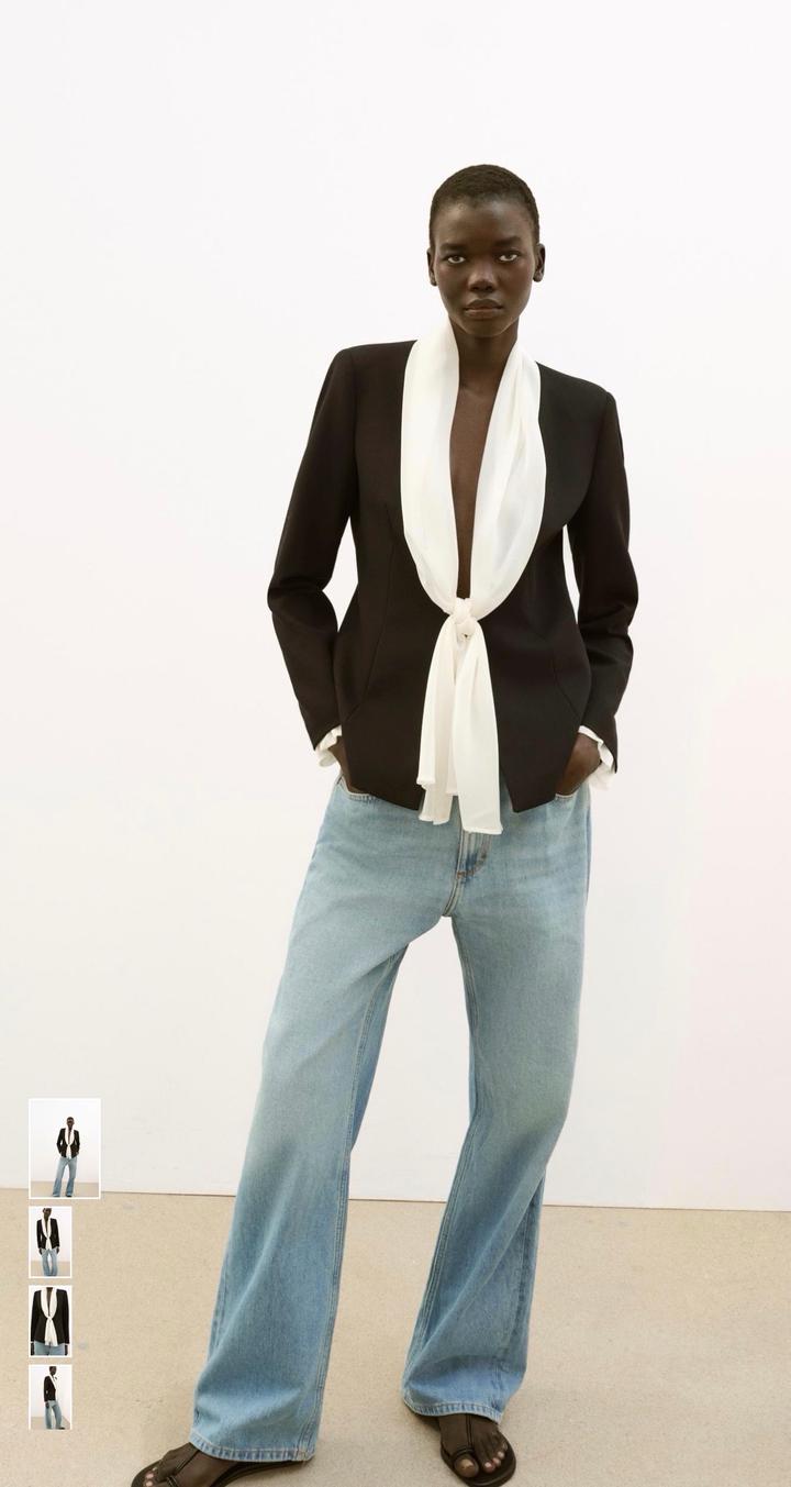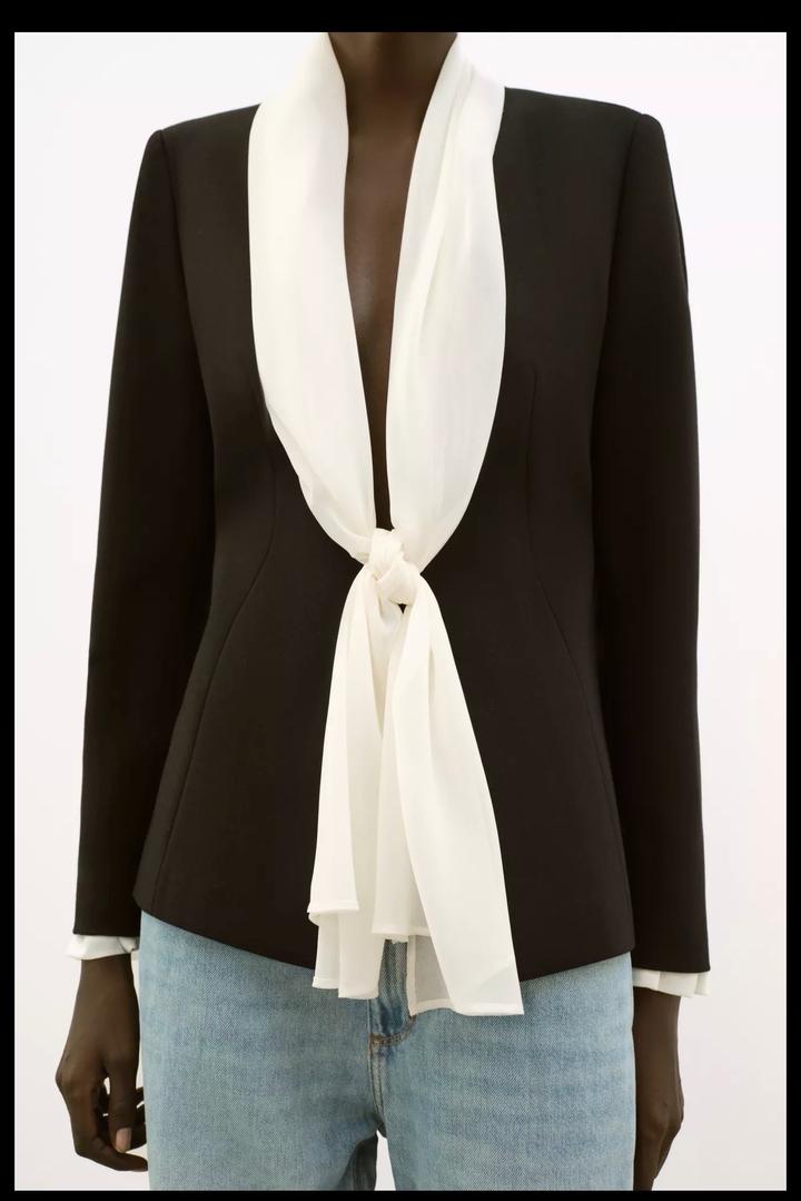 Блейзер с воротником с лацканами. Длинные рукава с подплечниками. Потайная застежка на крючки спереди, завязка. Артикул: 594056