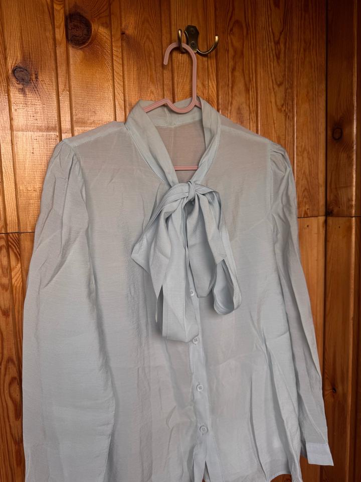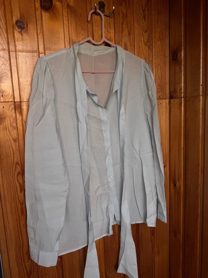 Светло-голубая блузка, с завязкой бантом(можно и другие способы). Размер one size (S/M) Ткань легкая(блузочка неглаженая,поэтому мятая) Артикул: 594222