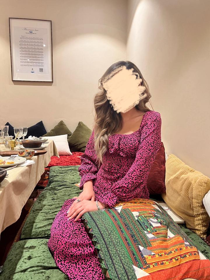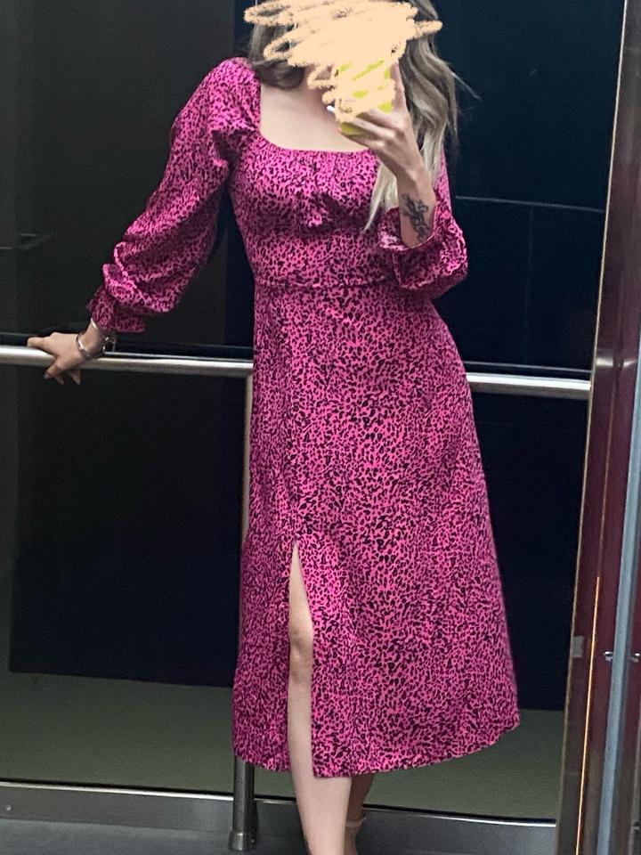 Красивое шелковод платье, с разрезом, яркое, женственное, сдержанное. Цвет фуксия с принтом Размер S/M Очень комфортное, легкое. На груди резинка Артикул: 594368