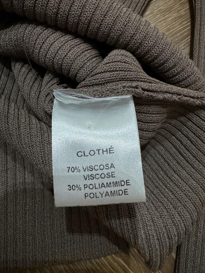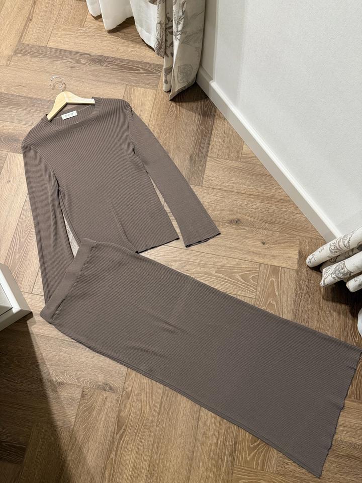 Костюм надевался ровно 1 раз. Сложный дорогой цвет, кофе с молоком. Трикотаж, хорошо тянется, подойдет на 42 и 44 размер. Юбка длинная. Артикул: 594548
