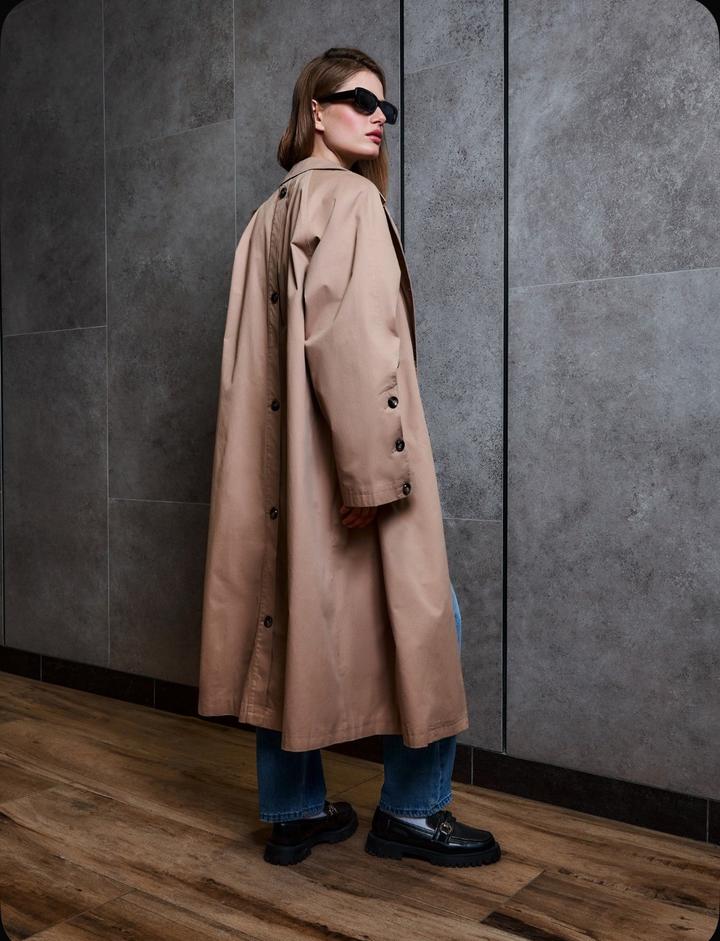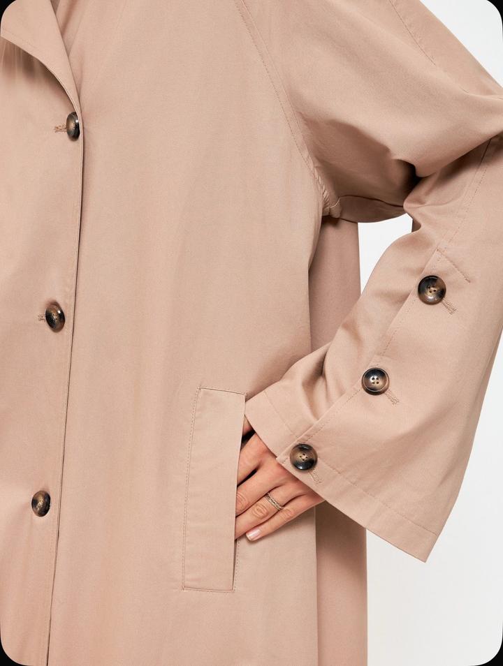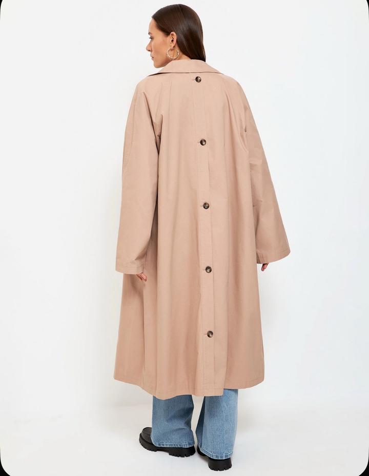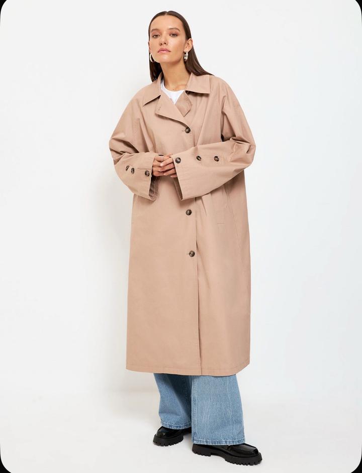 Длинное женское пальто прямого силуэта. Спереди центральная застежка на пуговицах и прорезные карманы. Спинка с центральным швом и кнопками. Рукава реглан с декоративными шлицами и пуговицами. Отложной воротник. Изделие с подкладкой. Артикул: 594565