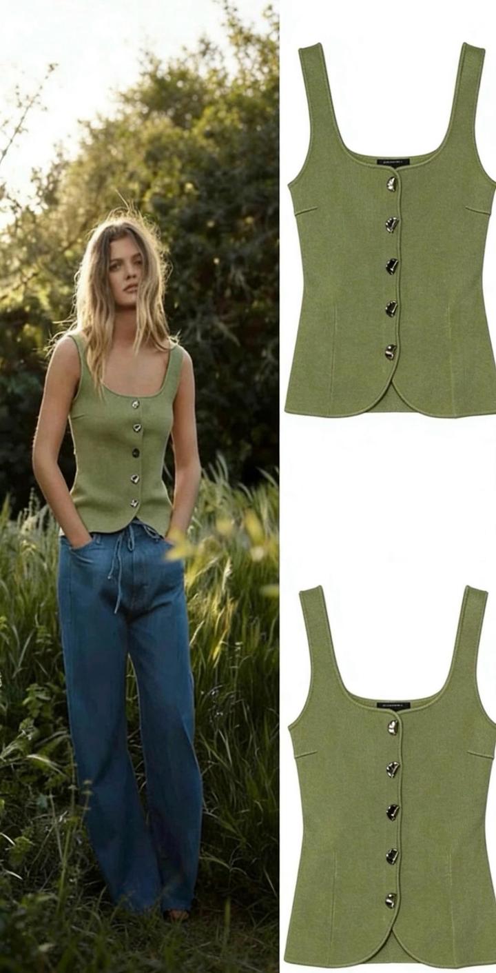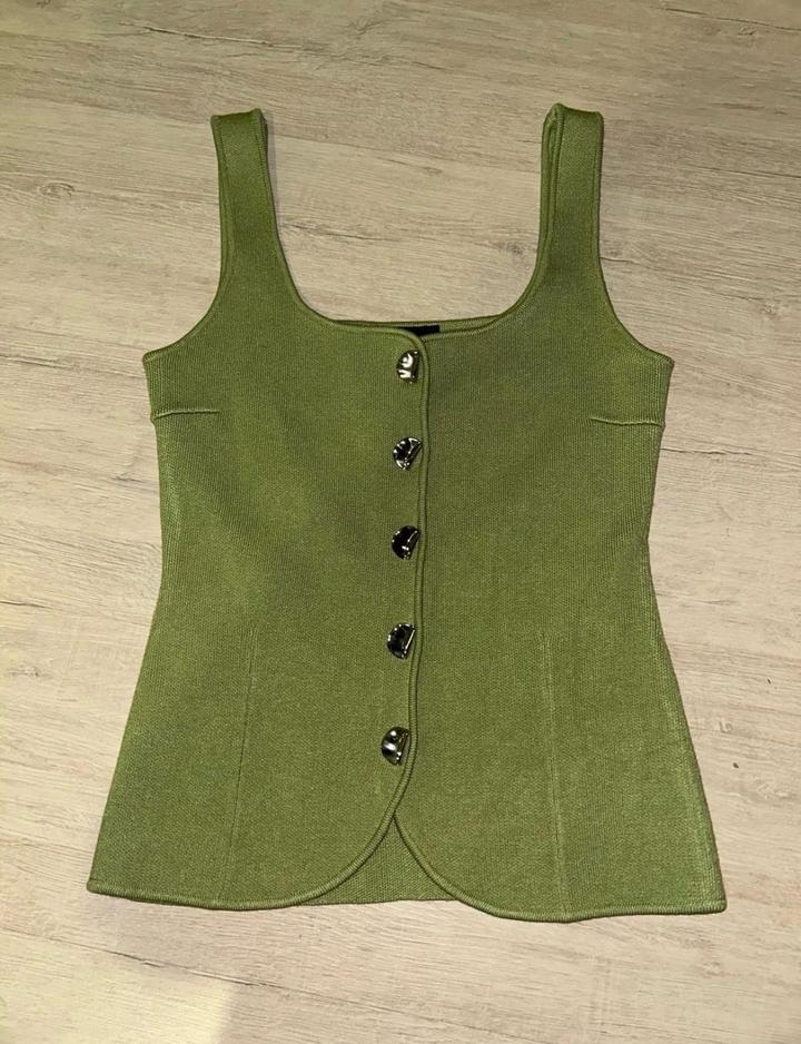 Топ-жилет вязаный ZARA оливкового цвета. Размер S Стильная приталенная модель из плотного трикотажа с квадратным вырезом и декоративными металлическими пуговицами спереди. Красиво подчёркивает силуэт и легко сочетается с джинсами, юбками и брюками. Состояние: надевала только 1 раз, всё на месте, состояние идеальное. Артикул: 594573