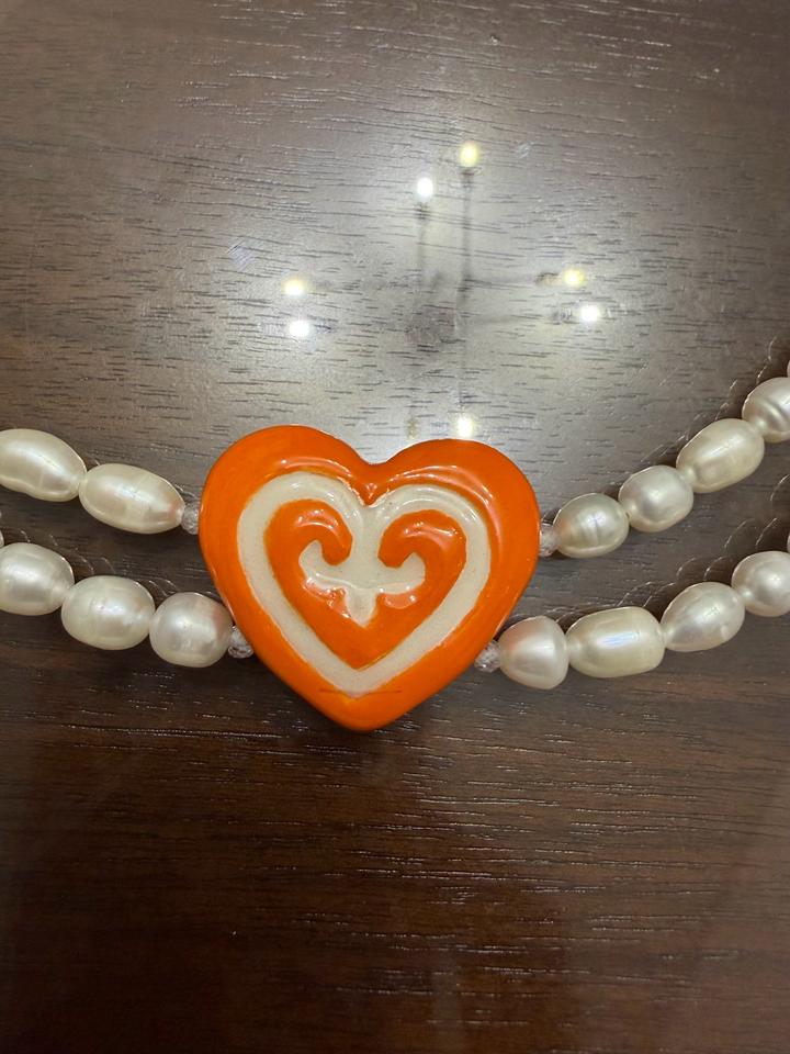 Чокер с этно мотивом в виде сердца из керамики ручной работы. Жемчуг натуральный в два ряда. Украшение которое повысит градус стиля. Артикул: 594574