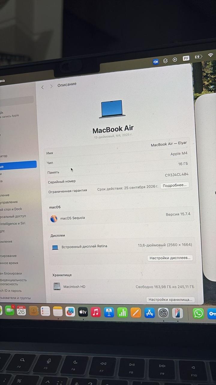 В продаже MacBook Air 2025 m4. Покупали в Америке. В комплекте, коробка зарядка имеется. Состояние идеальное, так как следили и ухаживали за ним все в пленке. 256 гб. Аккумулятор 100. Покупали совсем недавно в октябре. Минусов нет. Продам реальному покупателю ! Артикул: 594583