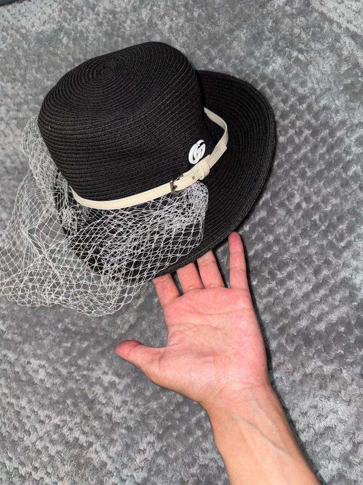 Головной убор на лето из твердого материала держит форму , при этом удобная , внутри есть нитью с помощью чего можно регулировать размер , есть ремешок и белая вуаль из сетки . Носила 1 раз Артикул: 594710