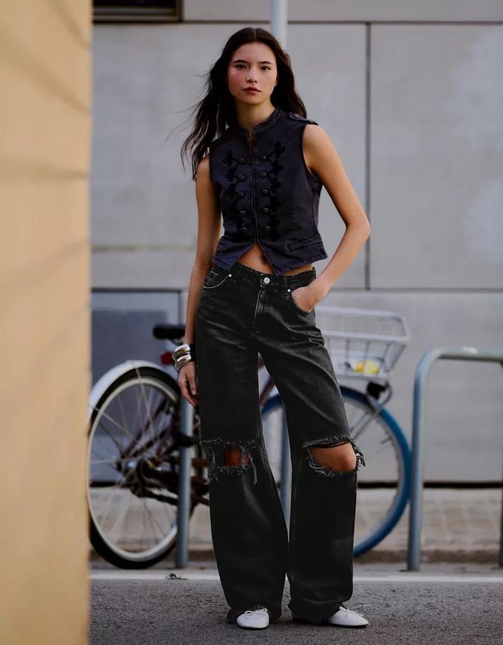 Джинсы на высокой посадке черные приглушенные рванные на коленях в стиле 90х широкие штанины фасон сейчас на пике популярности носибельный обоими полами и всеми возрастами. Эта модель идет всем ! Размер xs s 36 брала за 24990 отдам недорого Артикул: 594726