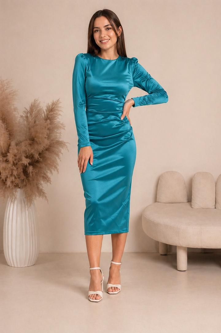 Платье атлас, размер S. Разрез по бокам. Носила 1 раз. Цвет бирюзовый. Нигде не просвечивает. Визуально утягивает живот за счет складок по бокам Артикул: 594737