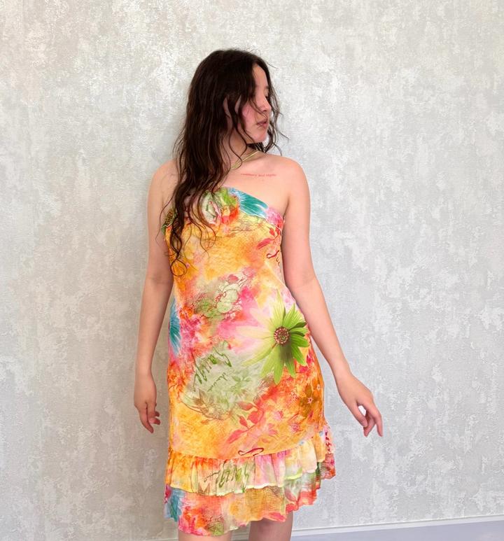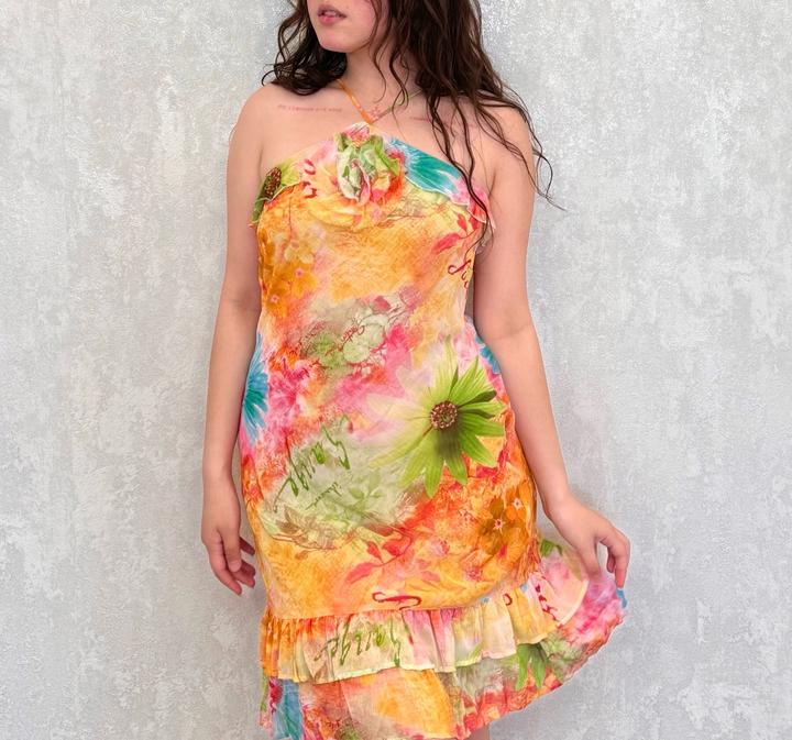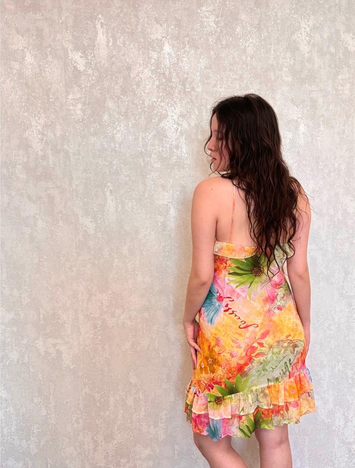 Винтажное платье итальянского бренда RICH🇮🇹 Насыщенный принт с цветочными мотивами, лёгкая ткань и игривый крой создают живой, запоминающийся образ. Красиво садится по фигуре и добавляет движения за счёт свободного силуэта и оборок. Идеально для летних образов и отпускного настроения. Размер: 44(M-L) Длина: 90 см Состояние: 10/10, без дефектов Состав: 100% пэ Стоимость: 12 000 тенге Модель: рост 165, ОГ 83, ОТ 73, ОБ 101, размер M Артикул: 594811