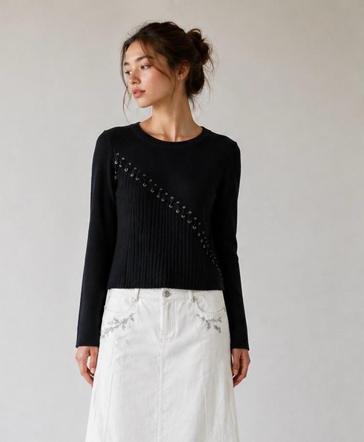Элегантный джемпер сочетание базовой классики и дизайнерского акцента. Выполнен из мягкого трикотажа, который приятно облегает фигуру и красиво держит форму. Главная изюминка — диагональная декоративная шнуровка из натуральной кожи с металлическими люверсами, создающая стильный, современный и немного дерзкий образ. • Вертикальная фактура - визуально стройнит • Аккуратный прямой крой • Круглый вырез • Универсальный черный цвет Артикул: 595276