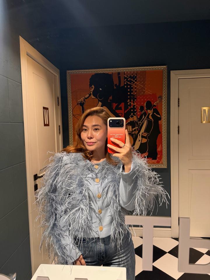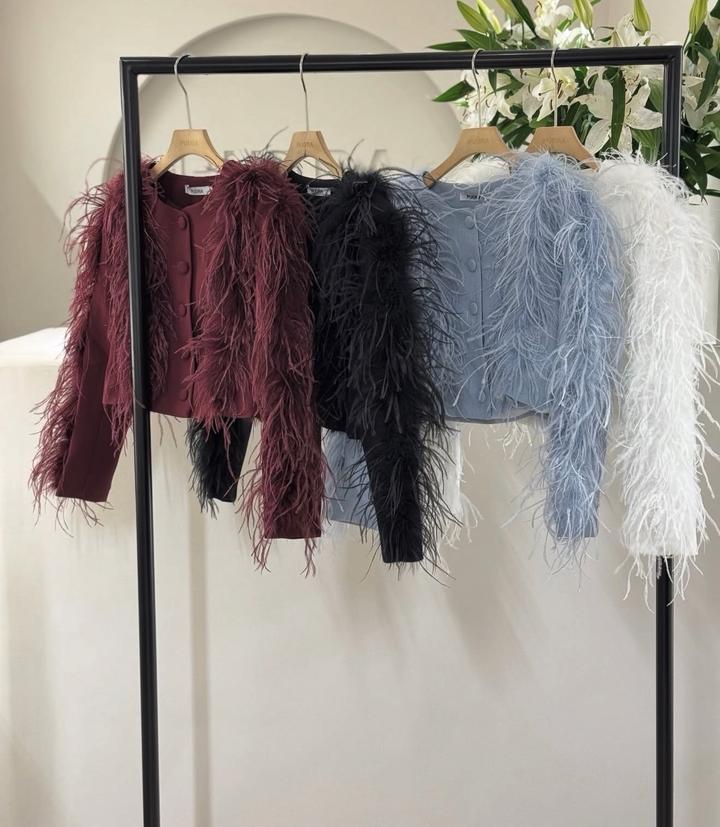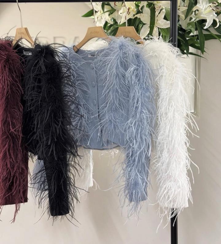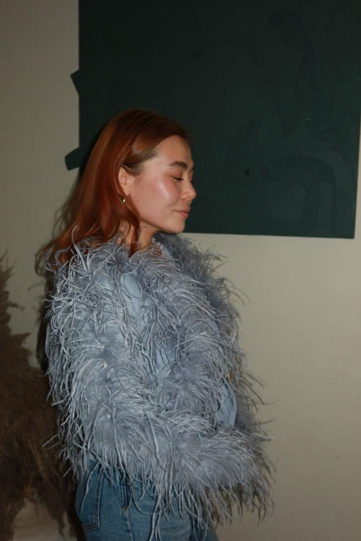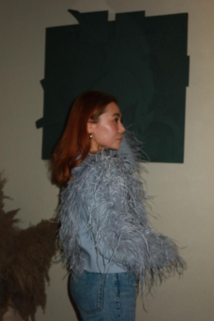 Жакет с перьями пудра, в голубом цвете. Размер С, состояние отличное, носила два раза Артикул: 595293