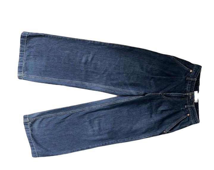 Характеристики: • Крой: свободный, прямой, с широкими штанинами • Посадка: высокая талия • Детали: контрастная строчка, классические задние карманы, кожаная бирка на поясе • Стиль: повседневный, универсальный, подходит под разную обувь и верх Артикул: 595396