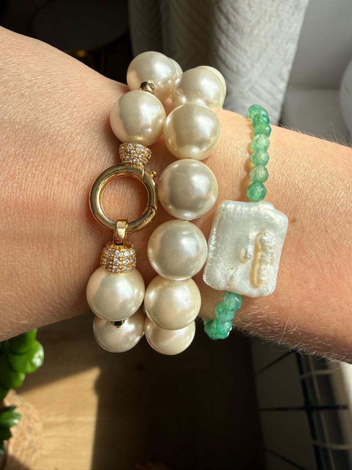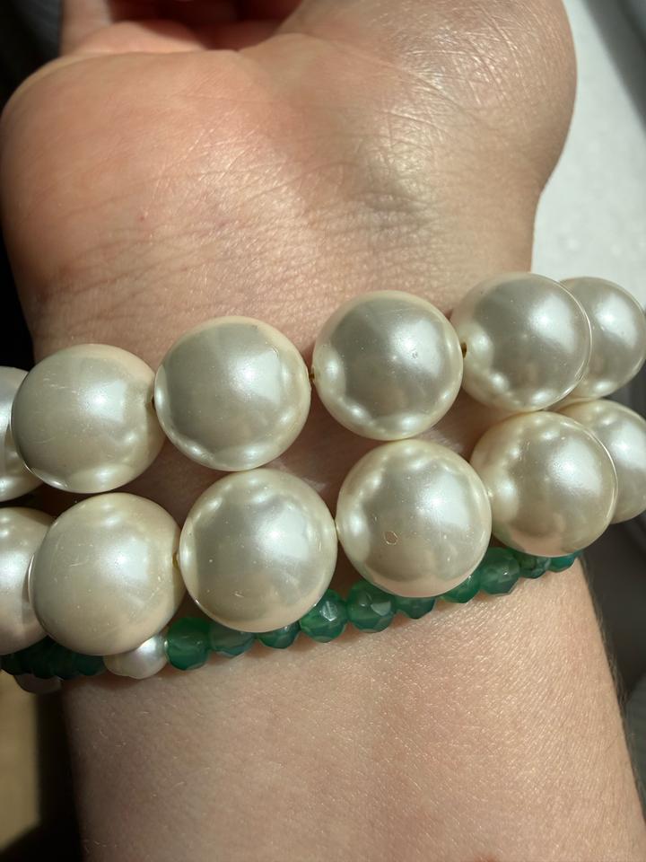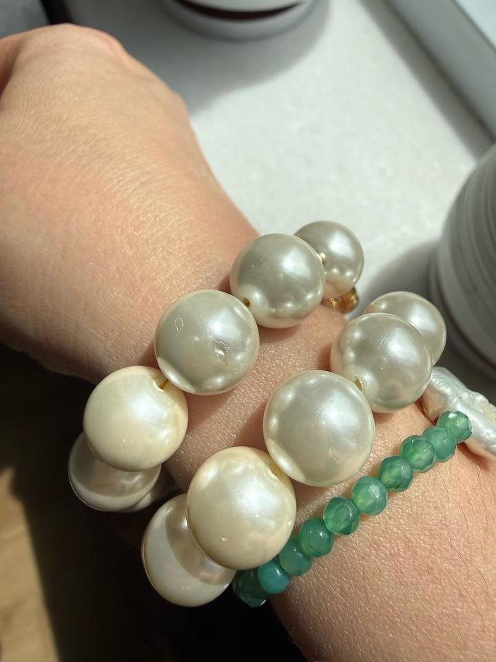 Браслеты ручной работы, 1 на ювелирном тросе и 2 на резинке. Камни жемчуг майорка, очень массивный и качественный Фурнитура немного потерта Артикул: 595443