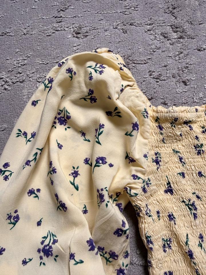 Блузка с цветочным принтом из штапеля. Пастельно желтый цвет с фиолетовыми цветочками. Этикетки срезаны, т.к. мешали Артикул: 595447