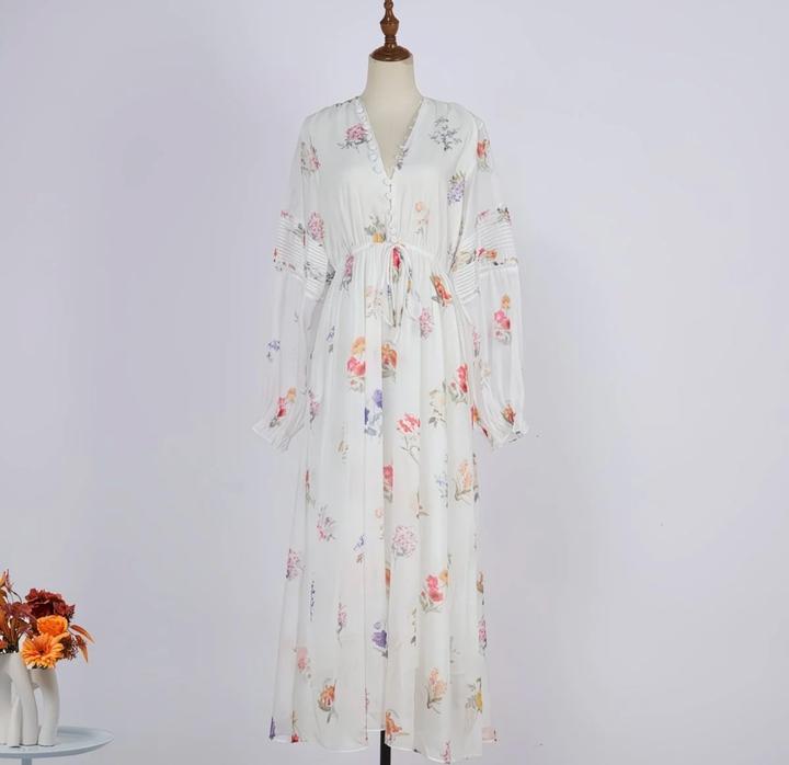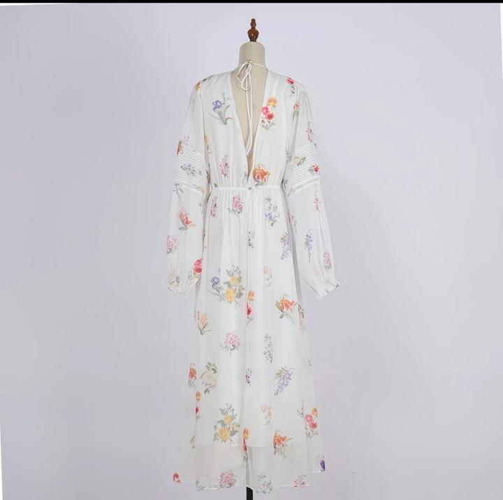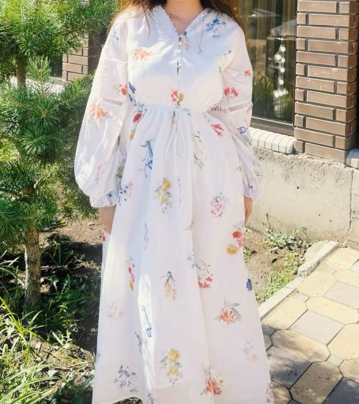 Нежное платье миди в белом цвете с цветочным принтом. Свободный крой, завязка на талии, длинные объёмные рукава. Сзади есть разрез. Лёгкое и воздушное идеально на лето и повседневные образы. Артикул: 595621