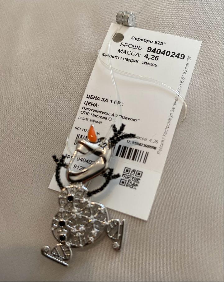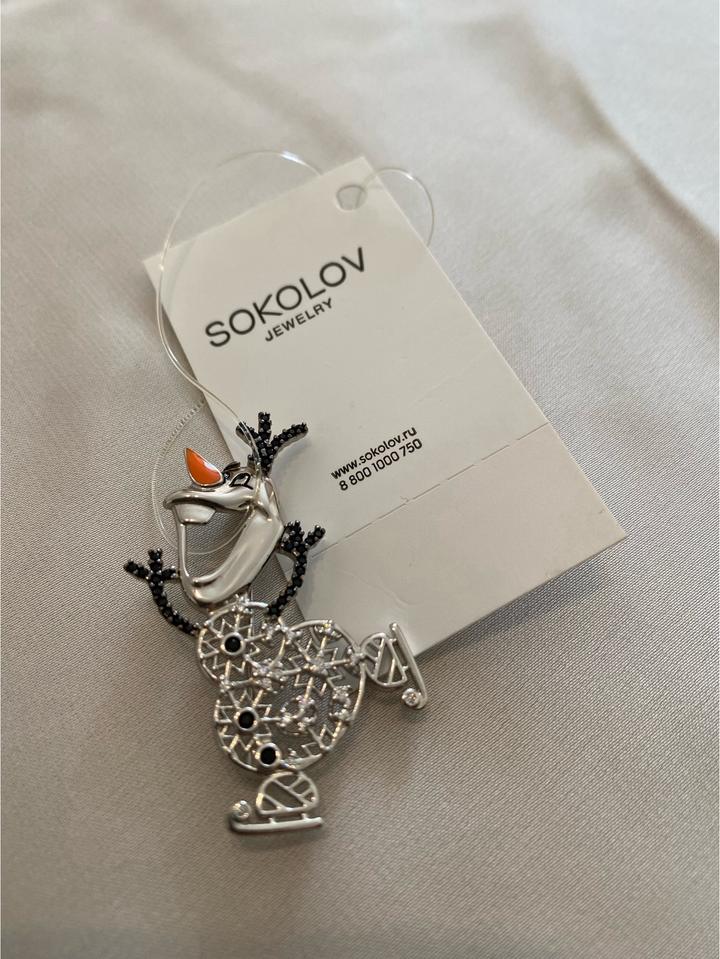 Серебряная брошь Sokolov. Тематический мерч из вселенной «Холодное сердце». Новая с этикеткой и пломбой. Эмаль и недрагоценные черные и прозрачные фианиты. Артикул: 595696