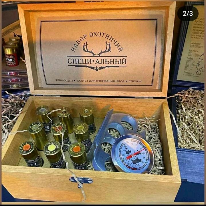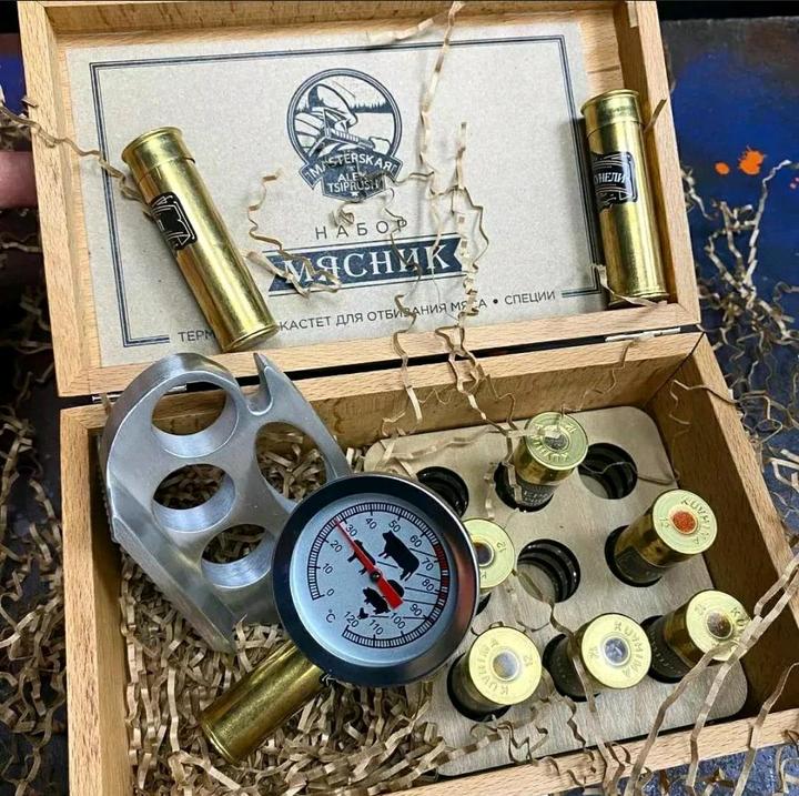 Набор в деревянном коробе Кастет для отбивания мяса Термощуп Специи в гильзах Артикул: 596088