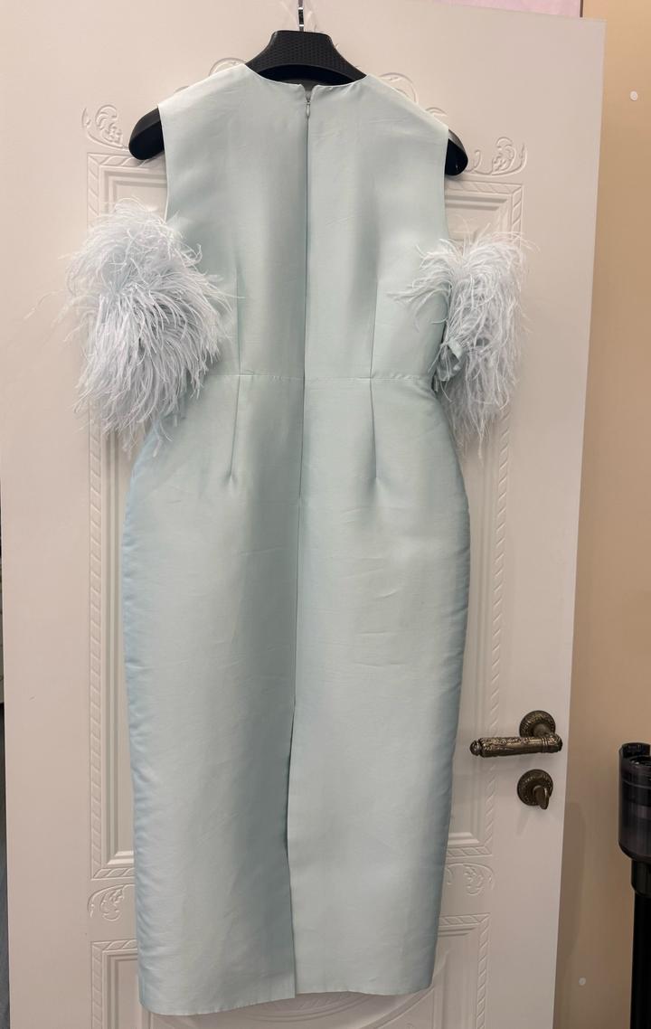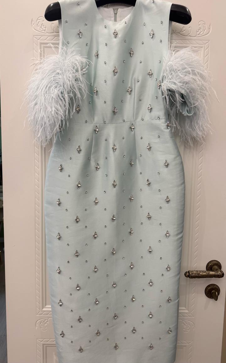 Нежное голубое платье миди с элегантным силуэтом. Модель выполнена в приталенном крое, который красиво подчеркивает фигуру. Особый акцент — объемные декоративные рукава и изящная расшивка мелкими камнями по всей длине, придающая образу утонченность и лёгкое сияние. Платье надевалось всего один раз, состояние практически новое. Размер: S/M(44) Артикул: 596104