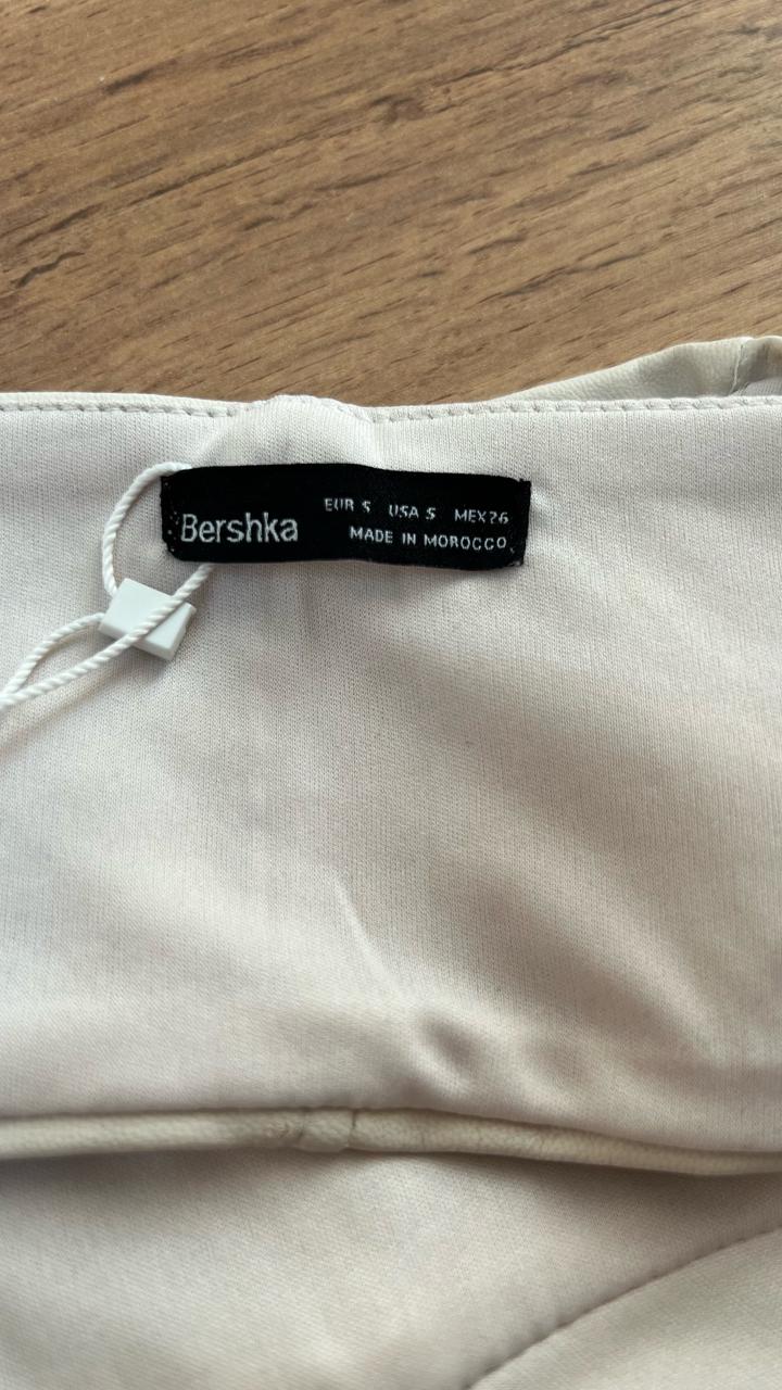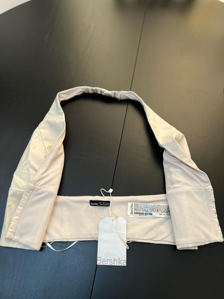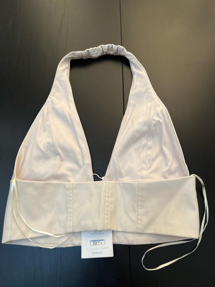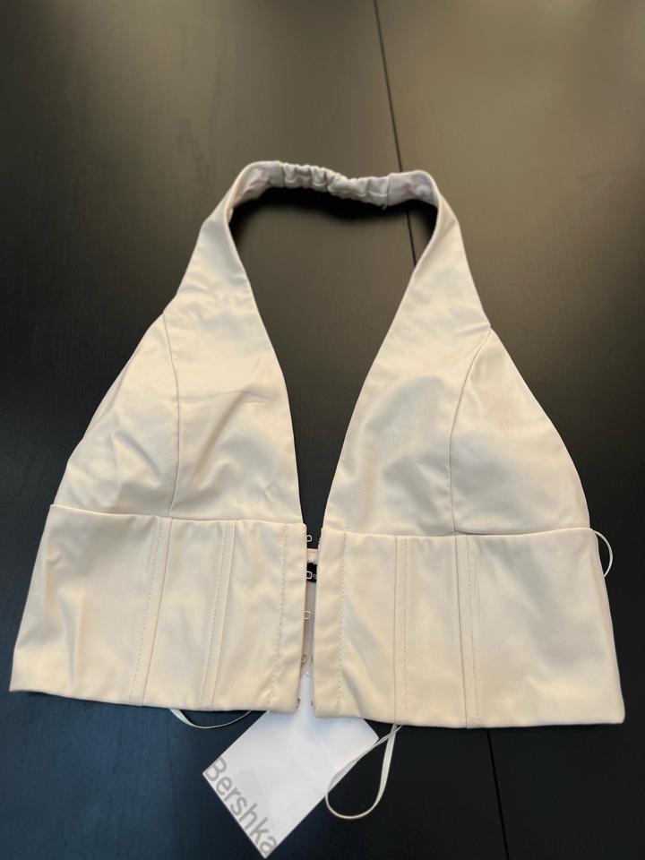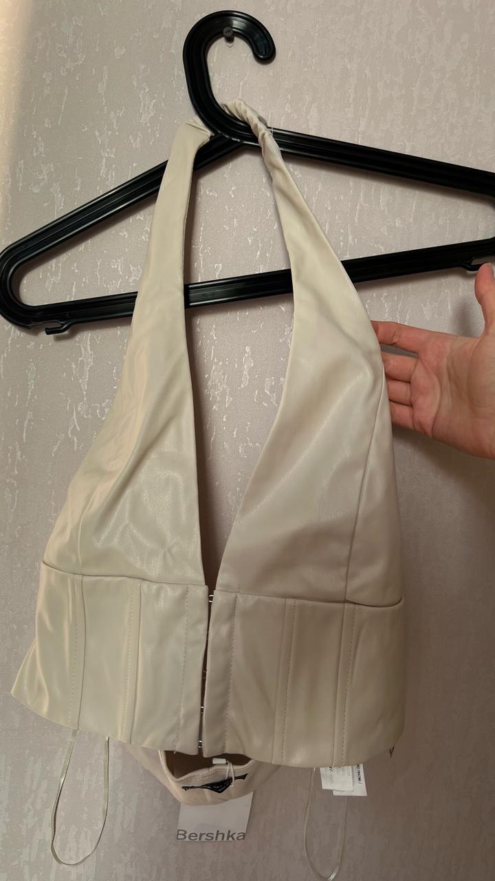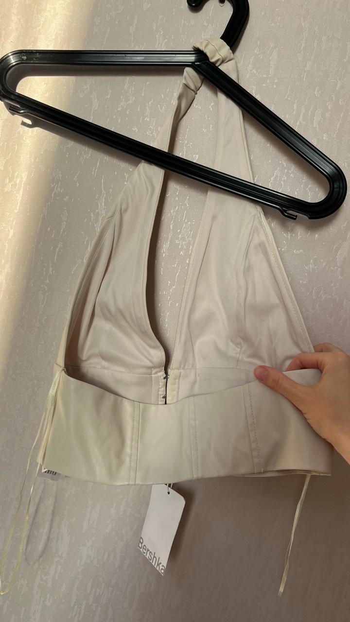 Кремовый топ-корсет Bershka с эффектом кожи и халтер-вырезом. Материал: Экокожа с гладкой текстурой. Дизайн: Модель халтер с глубоким V-образным вырезом и открытой спиной. Артикул: 596282