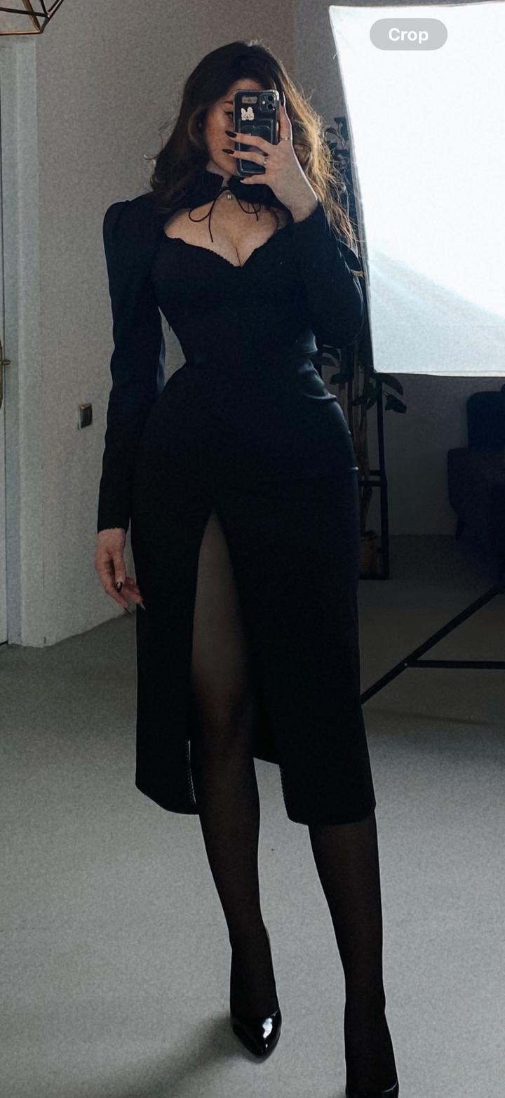 черное вечернее платье длины миди с кружевной отделкой, вырезом на груди и бедре. размер 44, замок сбоку Артикул: 596297