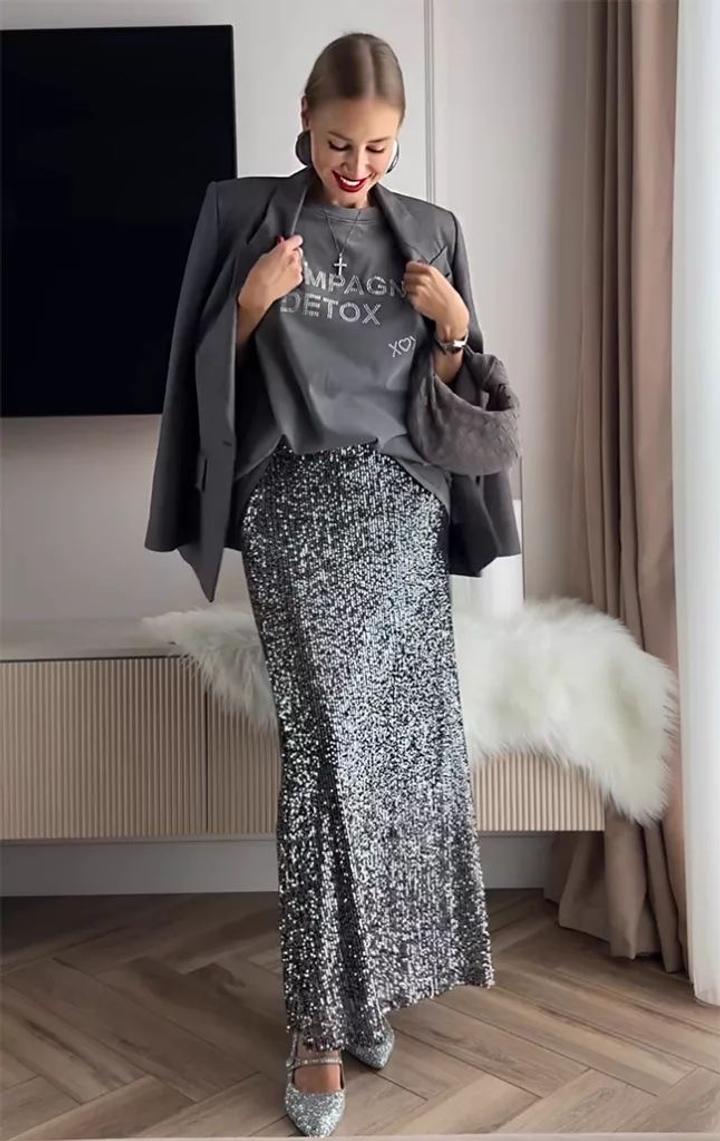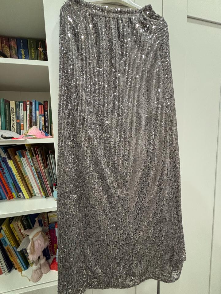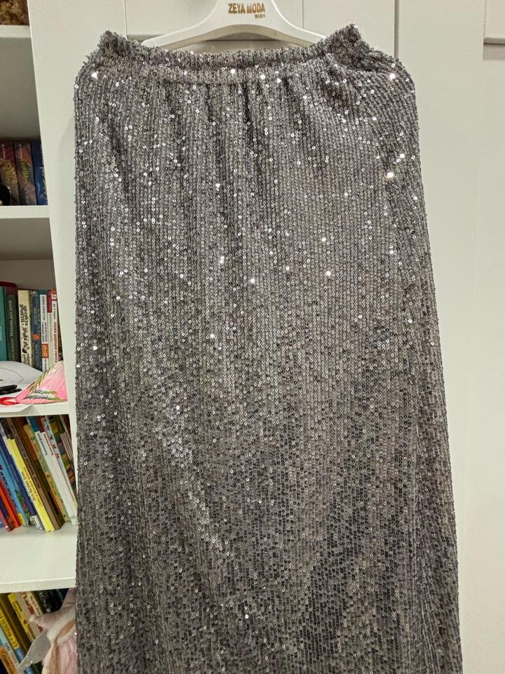 Производство Турция на s 40-42 юбка с подкладом серебро цвет вся в пайетках макси очень нарядная но можно стилизовать в кэжуал с футболкой кроссами ваша палочка выручалочка в гардеробе Артикул: 596449