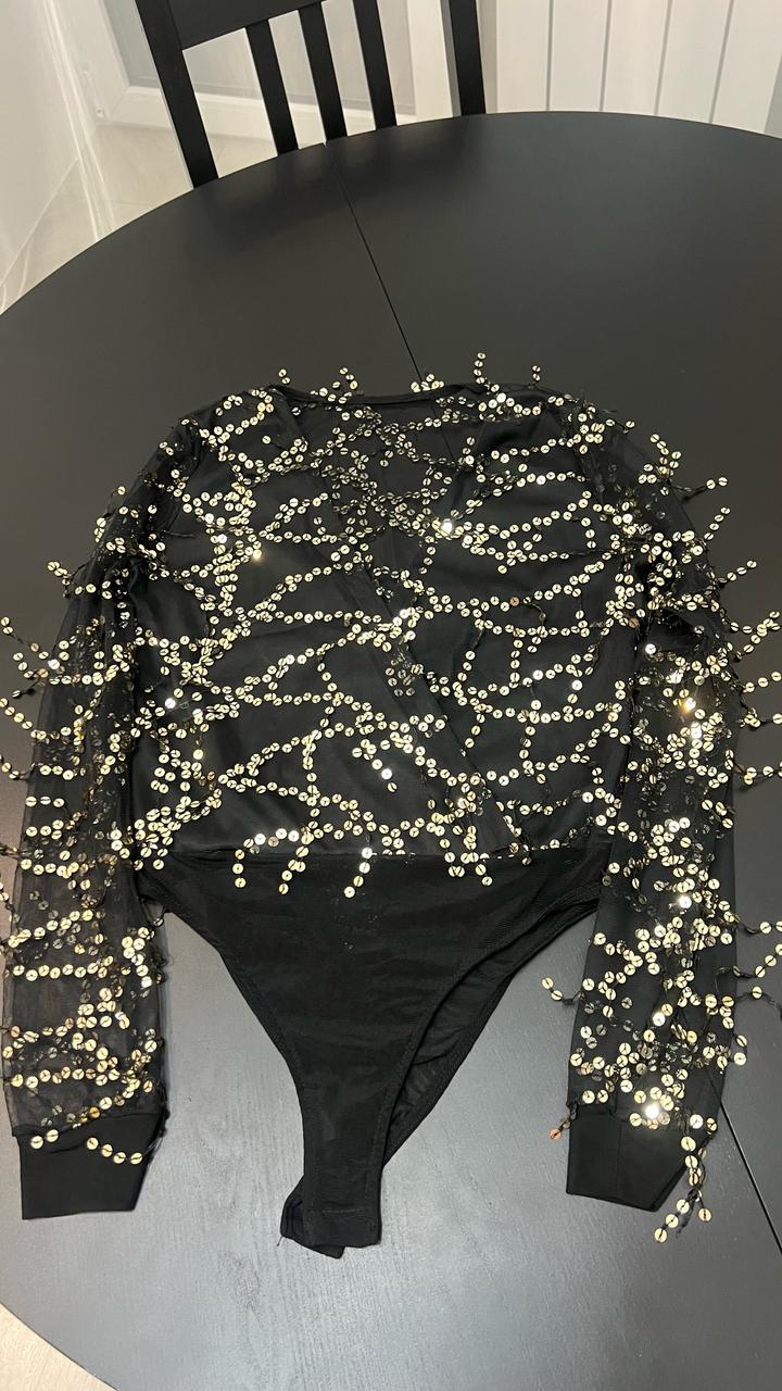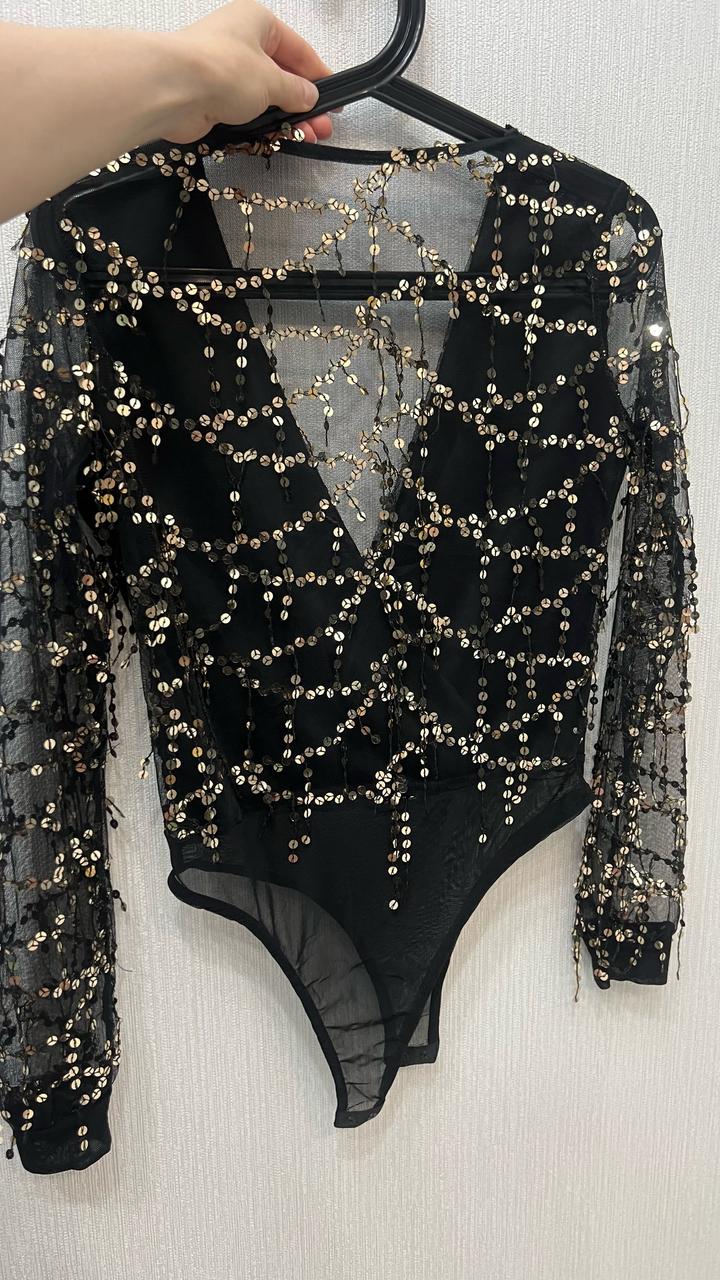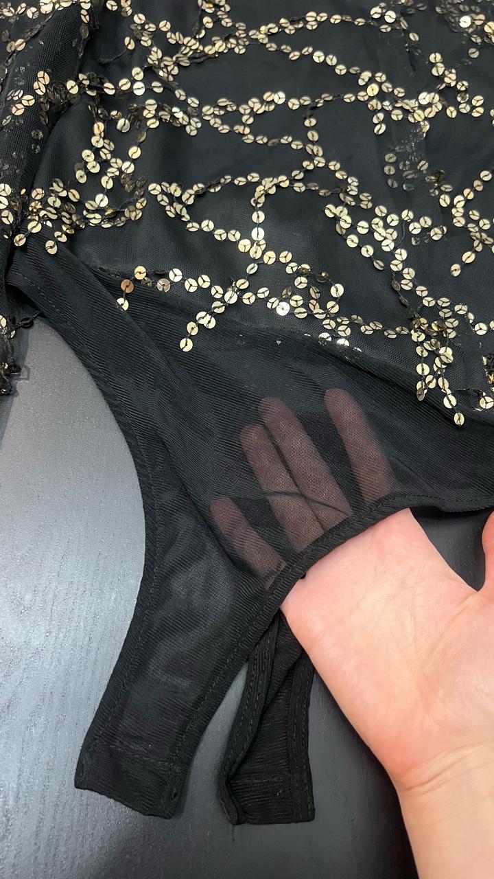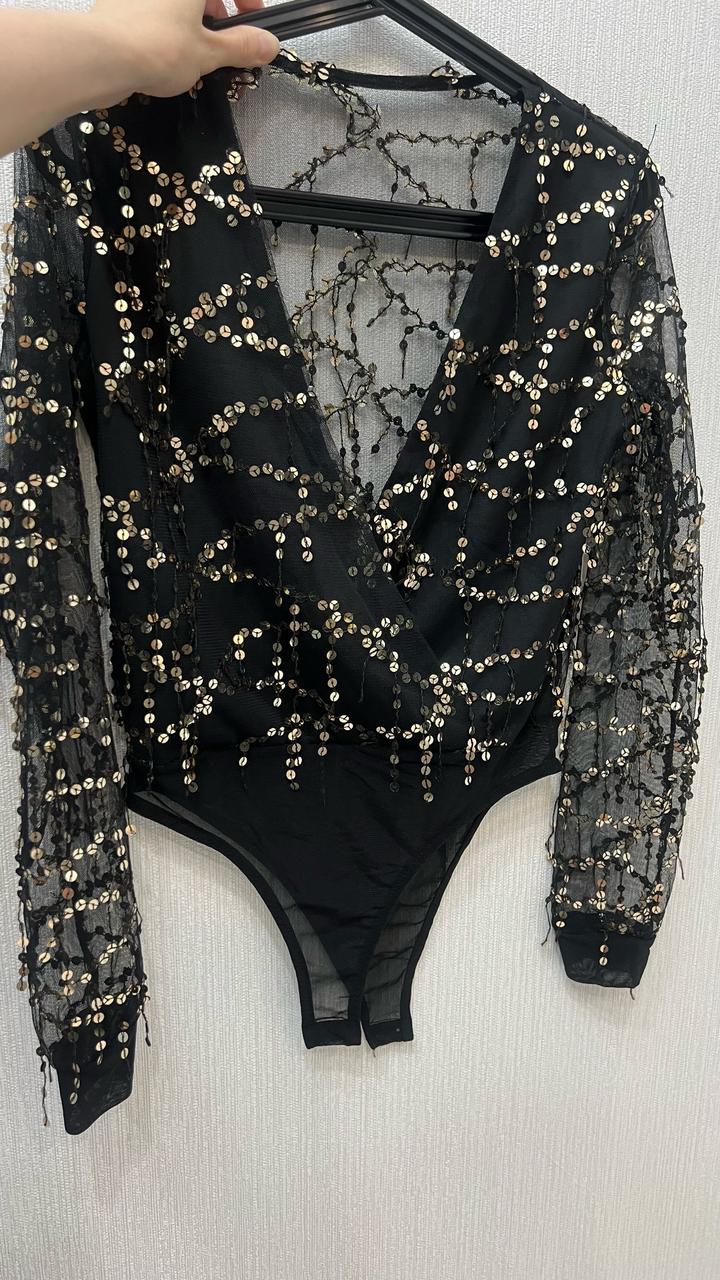 Шикарный черный Боди с золотистыми пайетками, вырез - на запах, спинка и рукава сеточка. Артикул: 596501