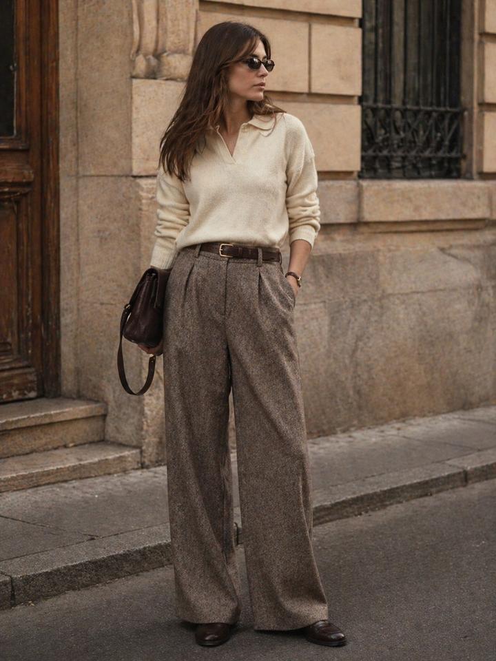 Твидовые брюки с высокой посадкой в благородном коричневом оттенке из 100% шерсти. Свободный силуэт и мягкие складки После х/ч. Артикул: 596558
