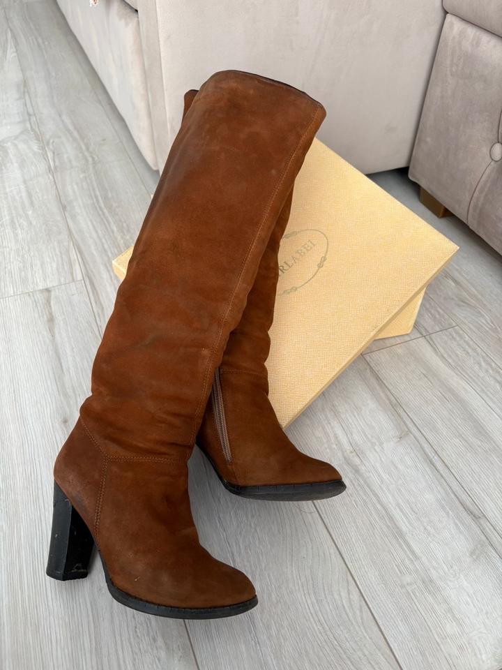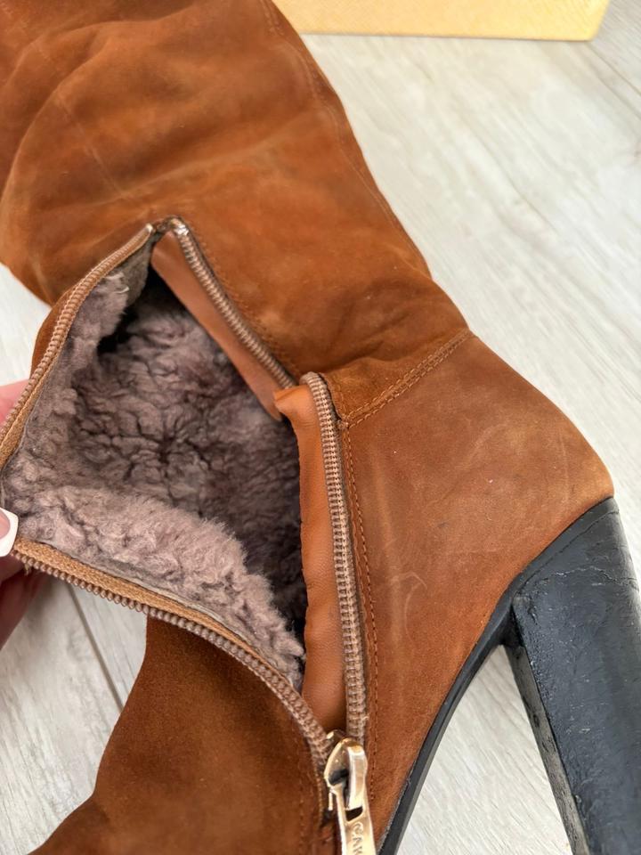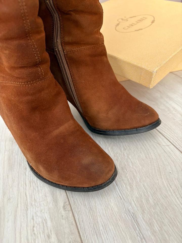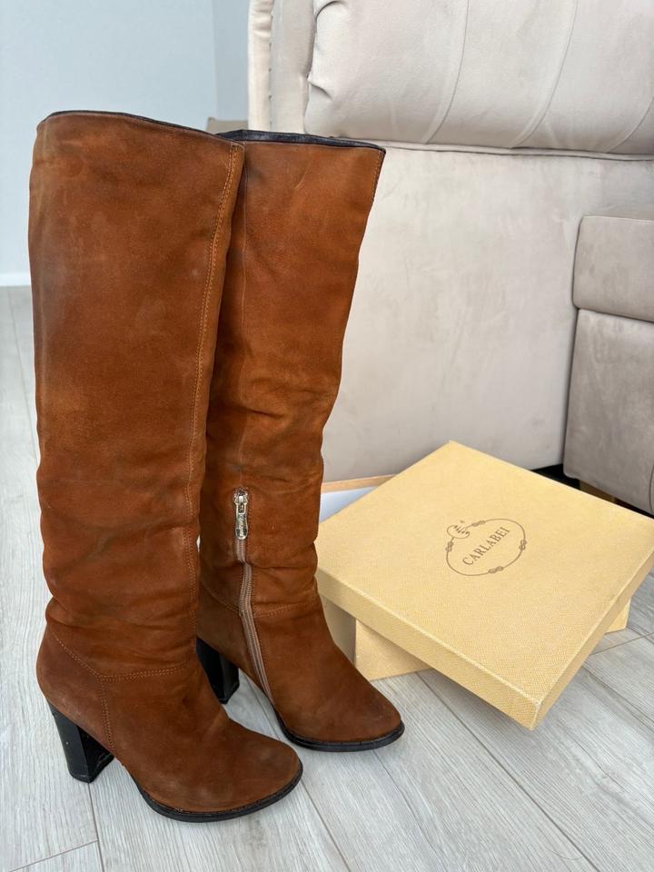 Сапоги из натуральной замши, рыже коричневого цвета. Бренд CARLABEI. В нормальном состоянии, при желании можно сдать их на реставрацию обновить цвет. Высота каблука 8 см. Очень удобная колодка. Евро зима, то есть внутри натуральный мех до ЩикоЛоток. Артикул: 596852