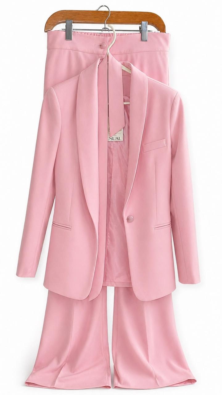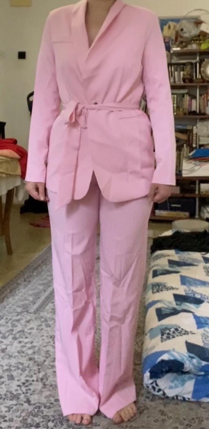 Женская двойка розового цвета. Пиджак с поясом и брюки классические. Не был в эксплуатации. Материал: 90% Полиэстер, 10% Эластан. Артикул: 596950