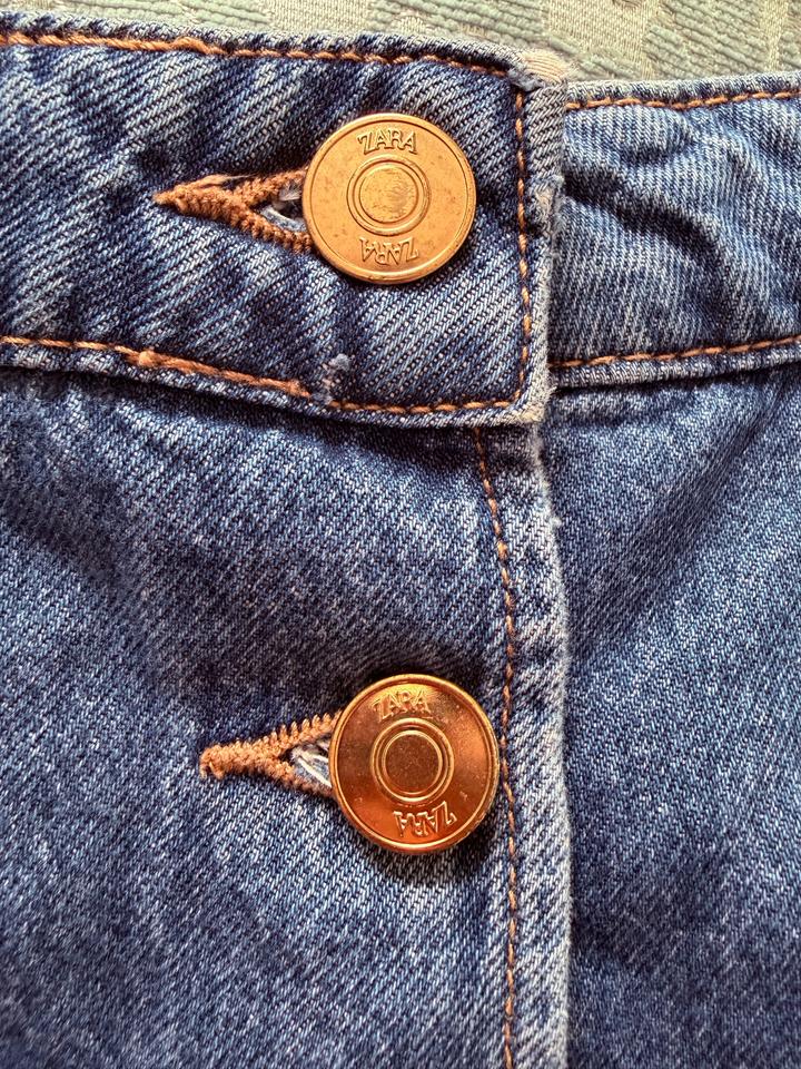 джинсовая юбка-шорты Zara в стиле мини имеет асимметричную застежку на пуговицы спереди и необработанный край. Артикул: 596968
