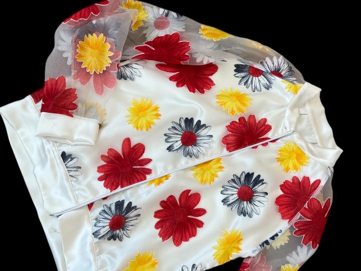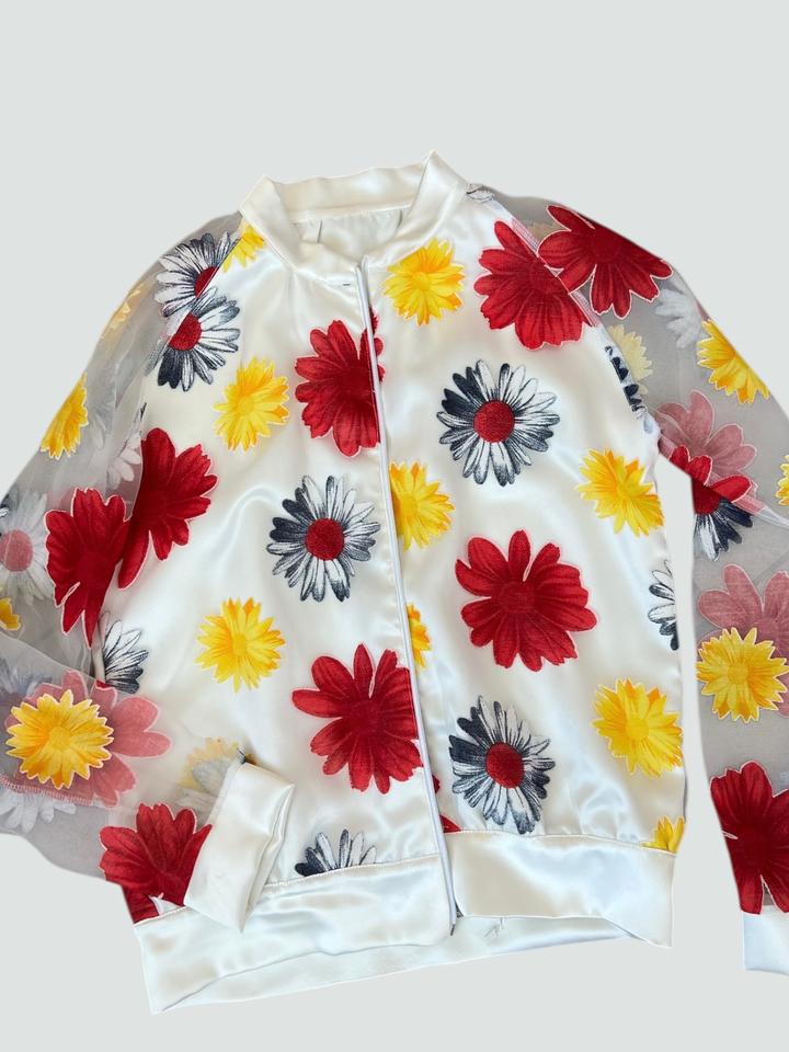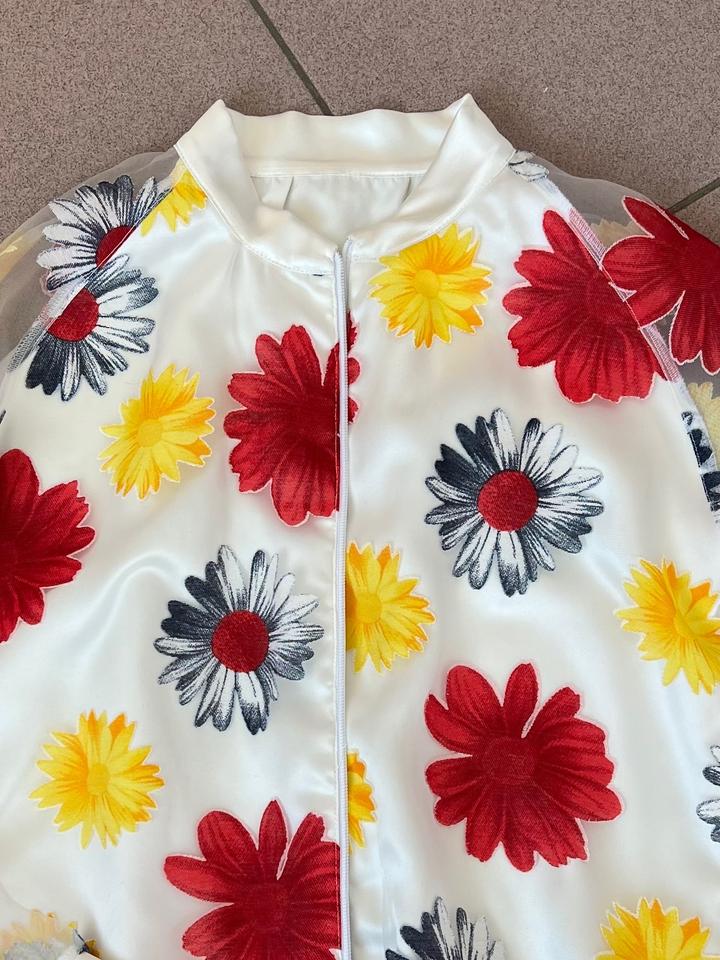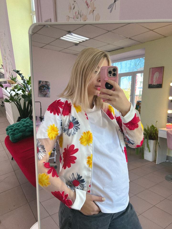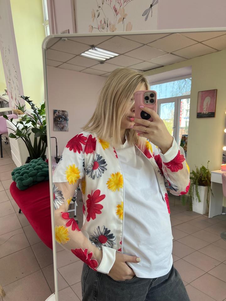 Дизайнерский бомбер, Основа слегка глянцевая ткань (сатин). Рукава — полупрозрачная сетка/органза с цветочным принтом. Очень эффектный, яркий, подойдет на размеры xs/s/m Артикул: 597026