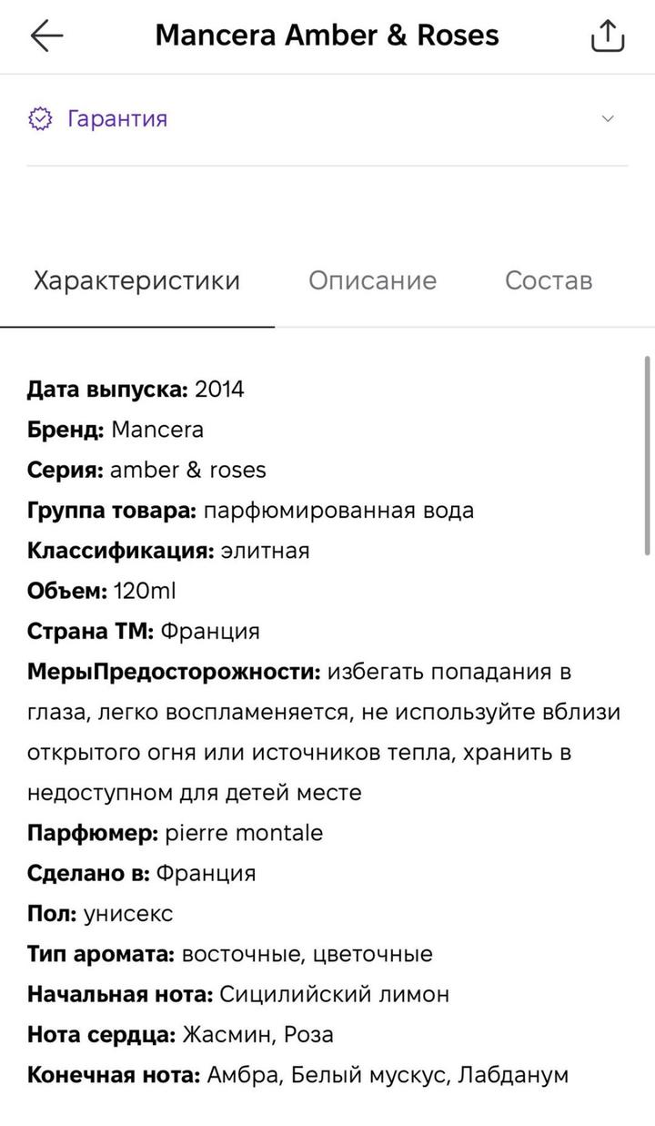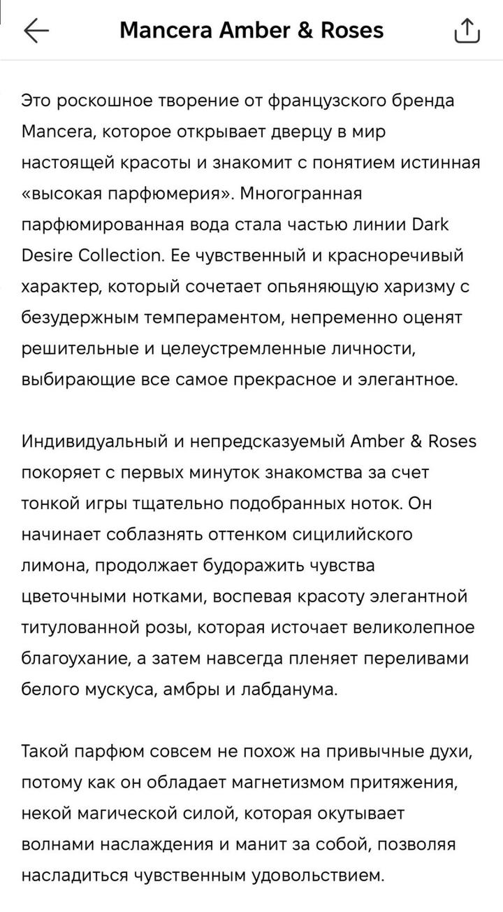 Мancera amber & roses Из 120 мл осталась половина парфюма Стойкий / унисекс Больше интересных вещей у меня в профиле , заглядывай 💛 Приятных покупок 💛 Благодарю что уделили время и внимание моей страничке 💛 Артикул: 597258