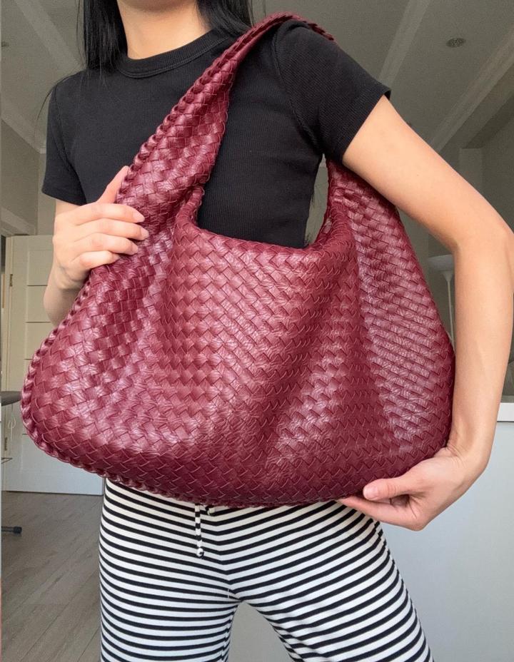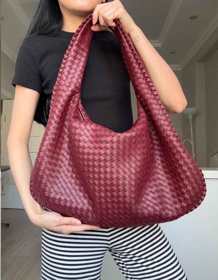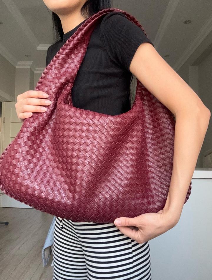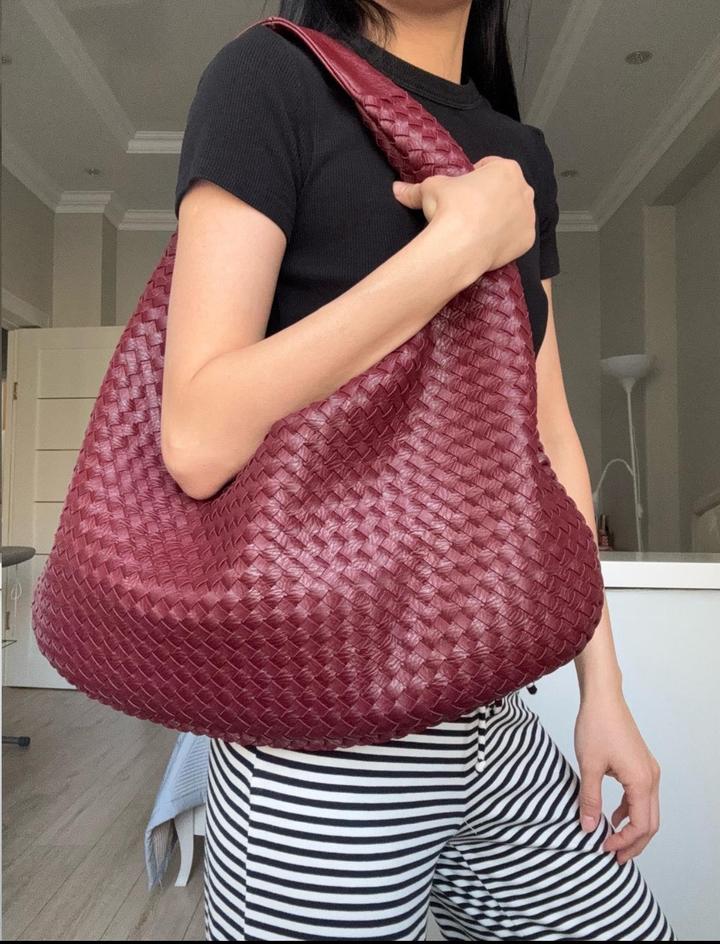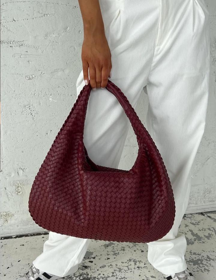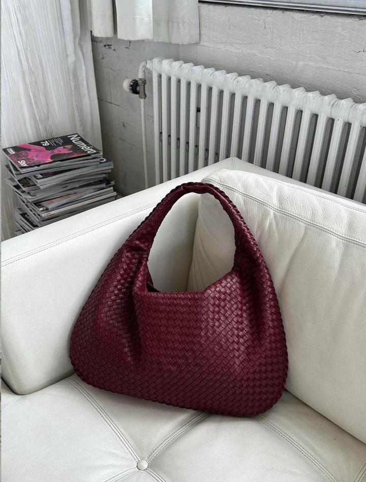Стильная сумка-хобо насыщенного бордового оттенка с плетёной фактурой из натуральной кожи. Модель мягкой формы, вместительная и удобная в носке, красиво смотрится на плече. Состояние идеальное. Шведский бренд Design by Si. Артикул: 597285