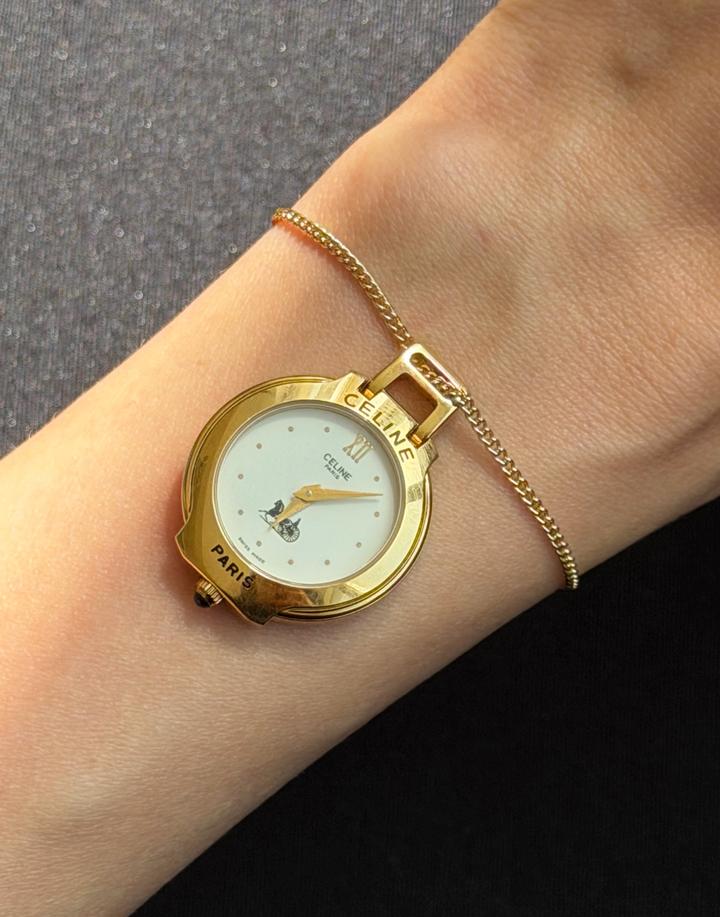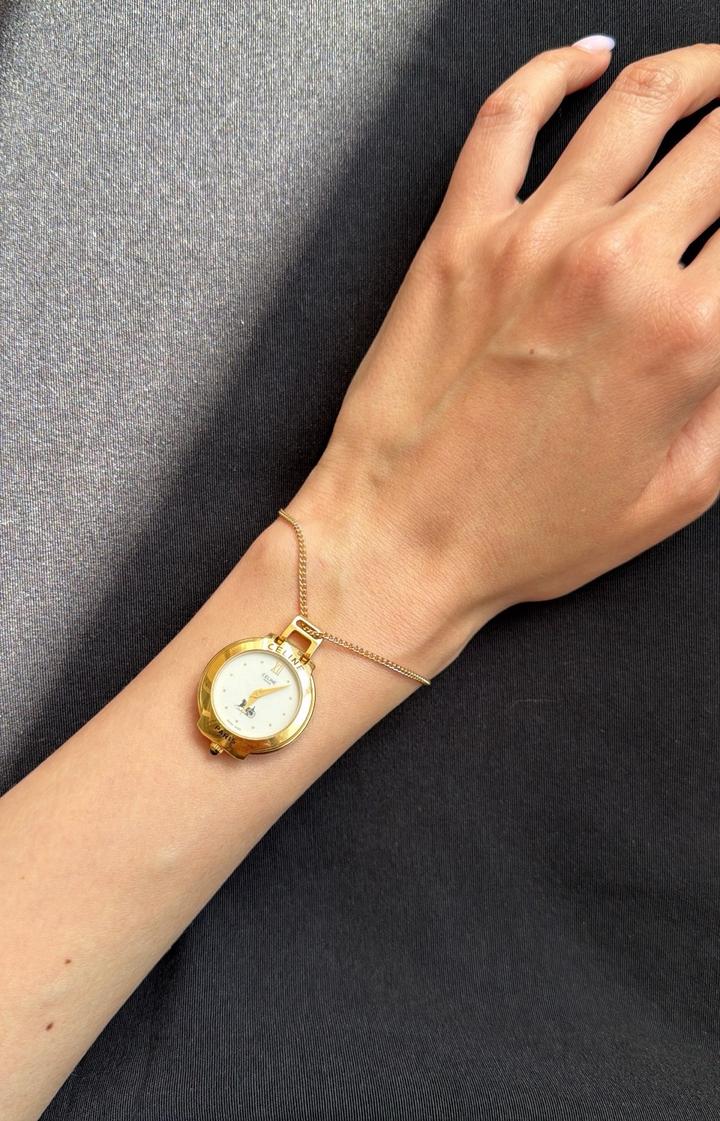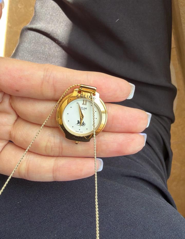 Редкая винтажная модель Celine - можно носить как браслетик, часы или как стильное украшение на цепочке 💫 Смотрятся очень эстетично и дорого. ✔️ Оригинал Celine ✔️ Часы на ходу ✔️ Золотистый цвет, аккуратный винтажный вид Состояние: хорошее, с минимальными следами времени (винтаж) Идеальный вариант для тех, кто ценит и ищет необычное винтажное украшение Артикул: 597509