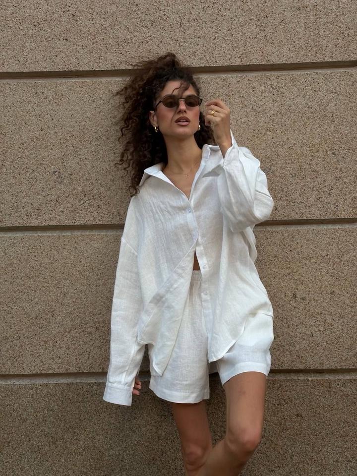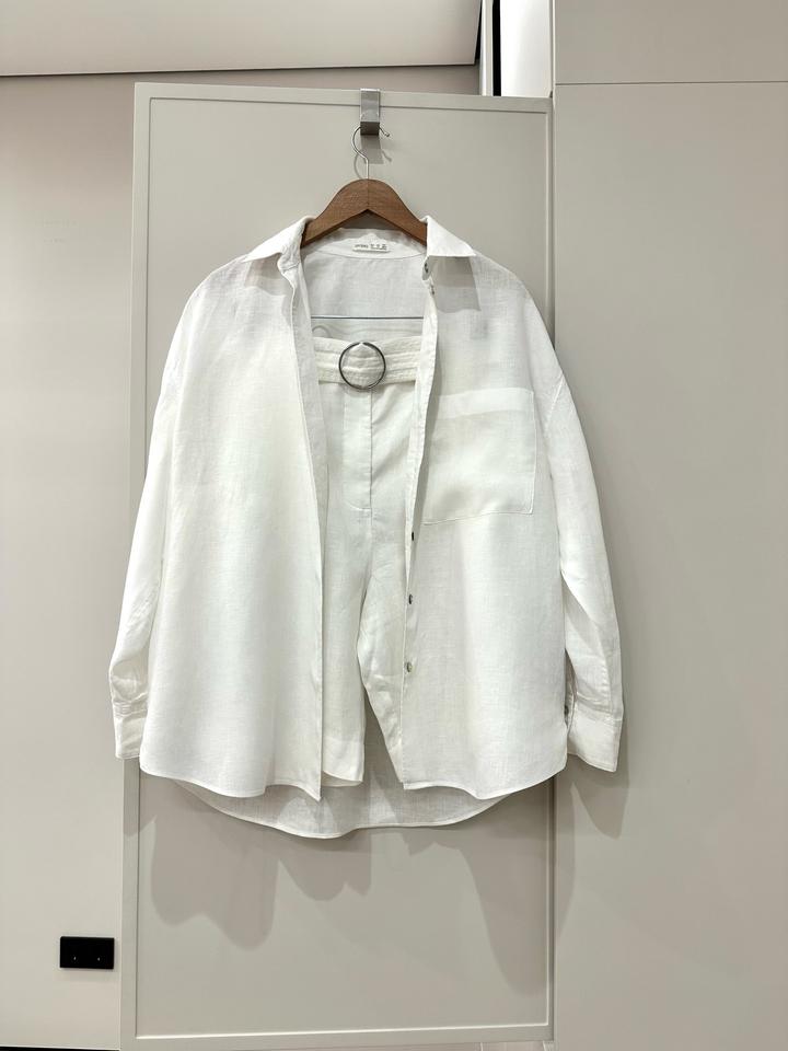 Стильный белый комплект из рубашки и шорт 100% лен Оптимальный вариант для жаркого лета ( легко комфортно удобно) Рубашка OYSHO оверсайз подойдет на S-M Шорты Mango 38 размер М (идут размер в размер) Без дефектов,в идеальном состоянии Артикул: 597565