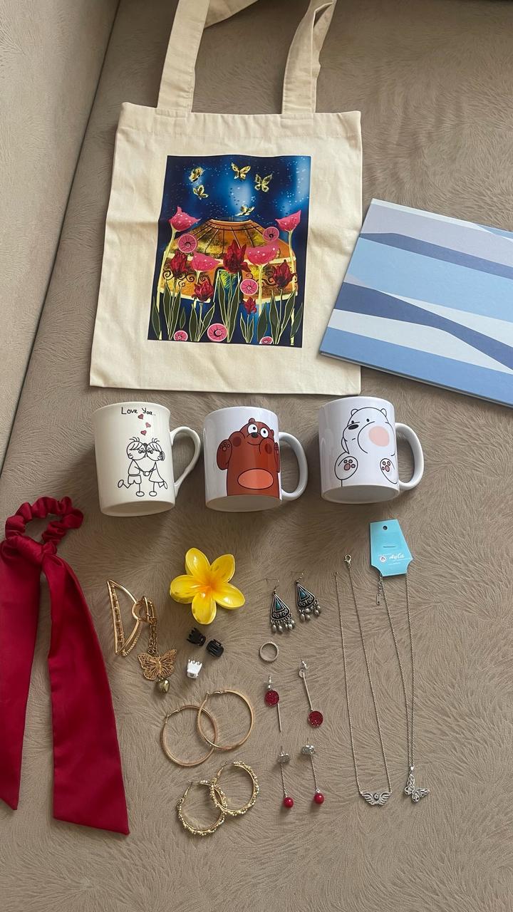 Продаю все вместе. Все вещи новые, не использованные. Тут бижутерии: серьги, кольцо, цепочки, для волос крабики, резинка. И зеркало, шоппер, бокалы. Артикул: 597661