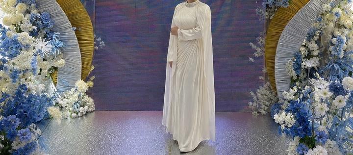 Платье длинное в пол (рост 168), с закрытым верхом и высоким воротником, украшенным камнями. Рукава сделаны в виде накидки, свободно спадают. Платье турецкого размера 44, но маломерит, подойдёт на 46–48 размер. Артикул: 597888