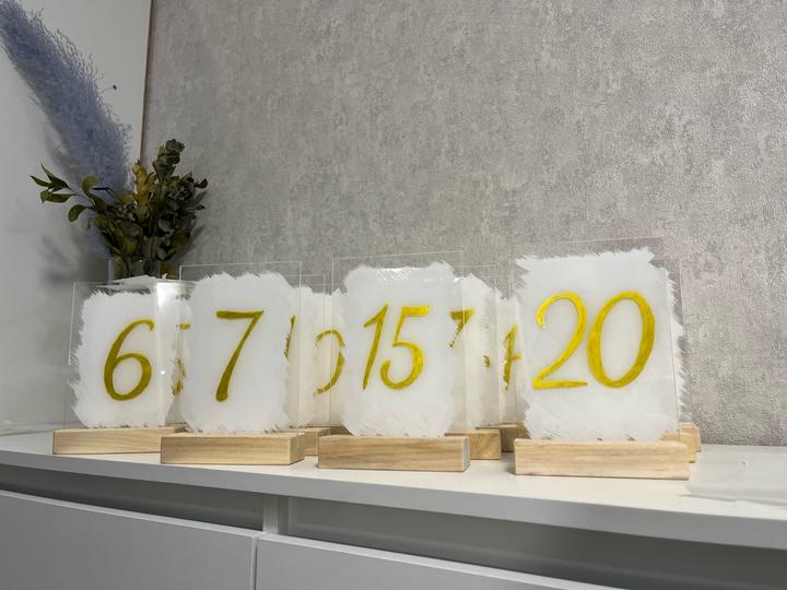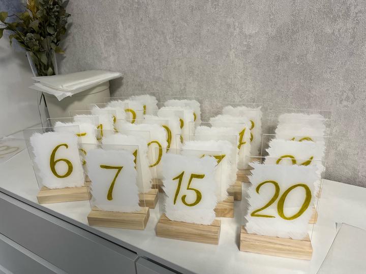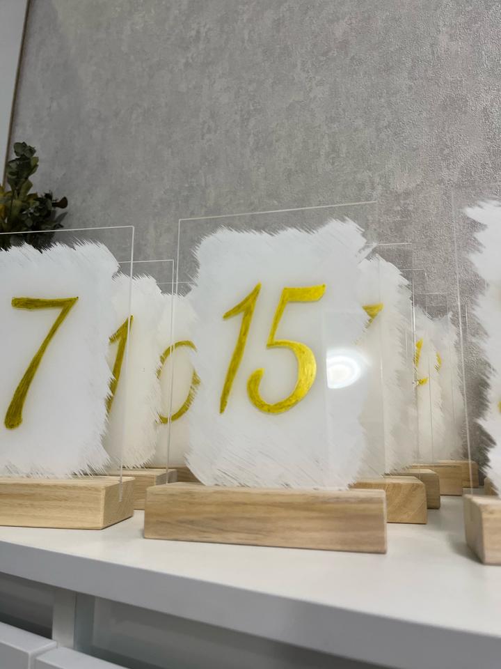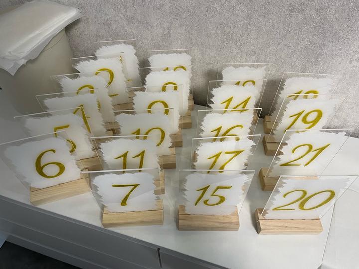 Номерки для столов, 21 штука, ручная работа, подставка дерево, сами номерки из акрила, очень качественные и красивые, использлвались на одно мероприятие Артикул: 597967