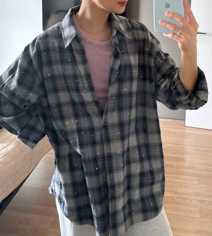 Рубашка оверсайз в клетку со стразами на пуговицах Артикул: 598036