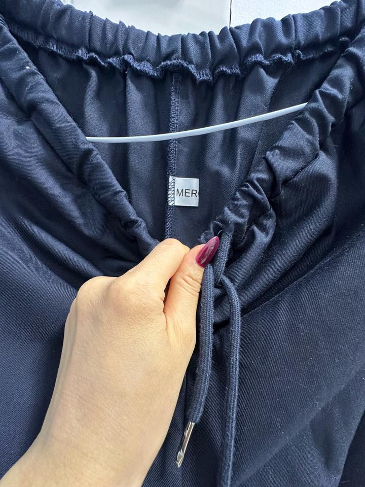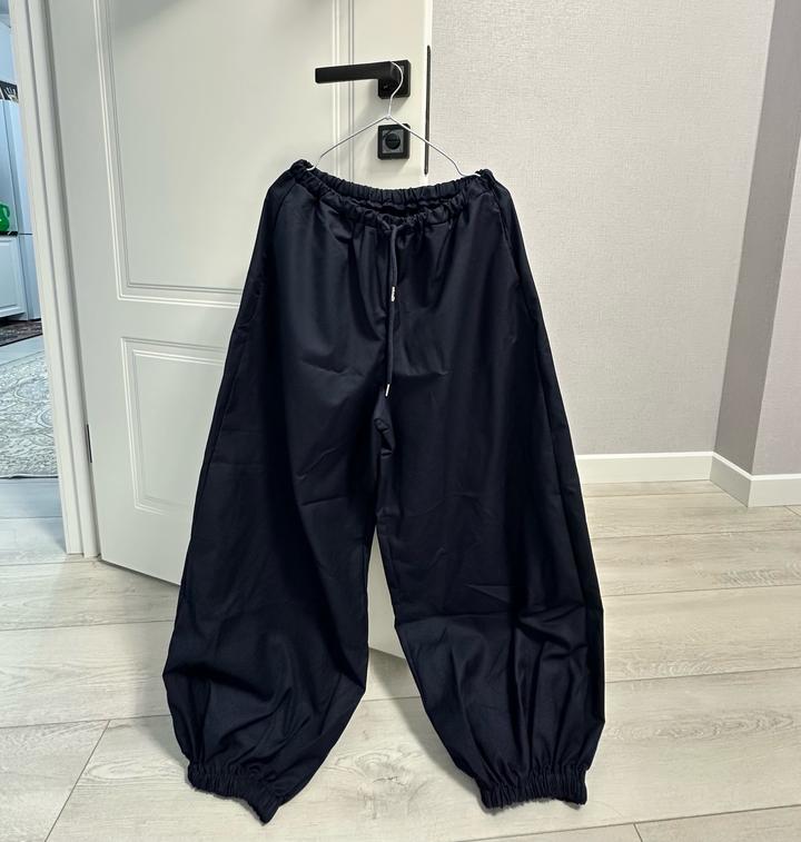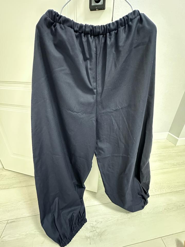 Брюки алладинки, размер стандартный, пояс на резинке и шнурке, цвет темно-синий, имеются боковые кармашки, материал на любой сезон, одевала пару раз, нет дефектов и пятен Артикул: 598395