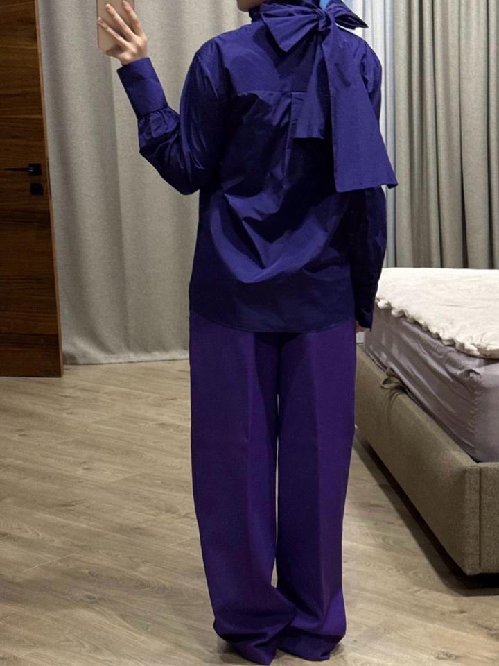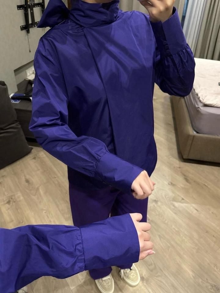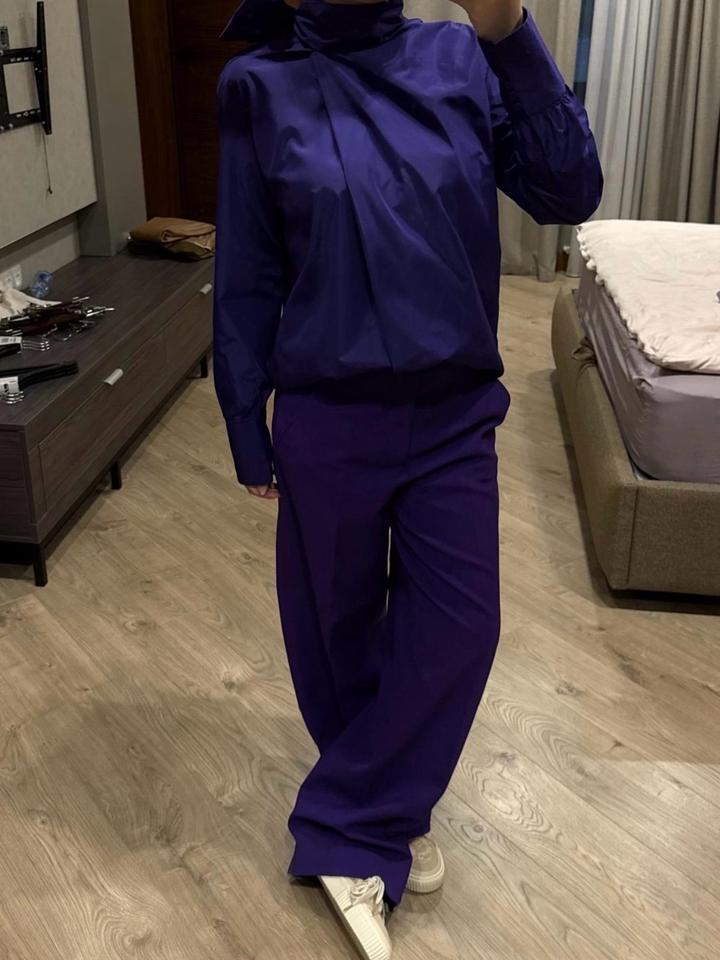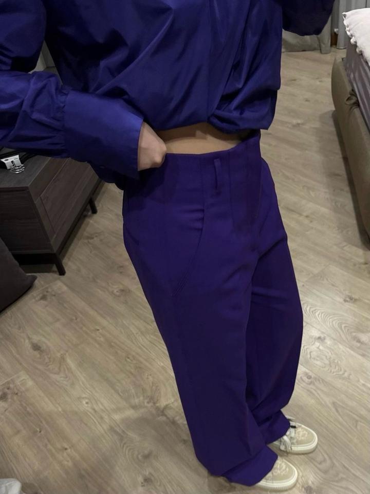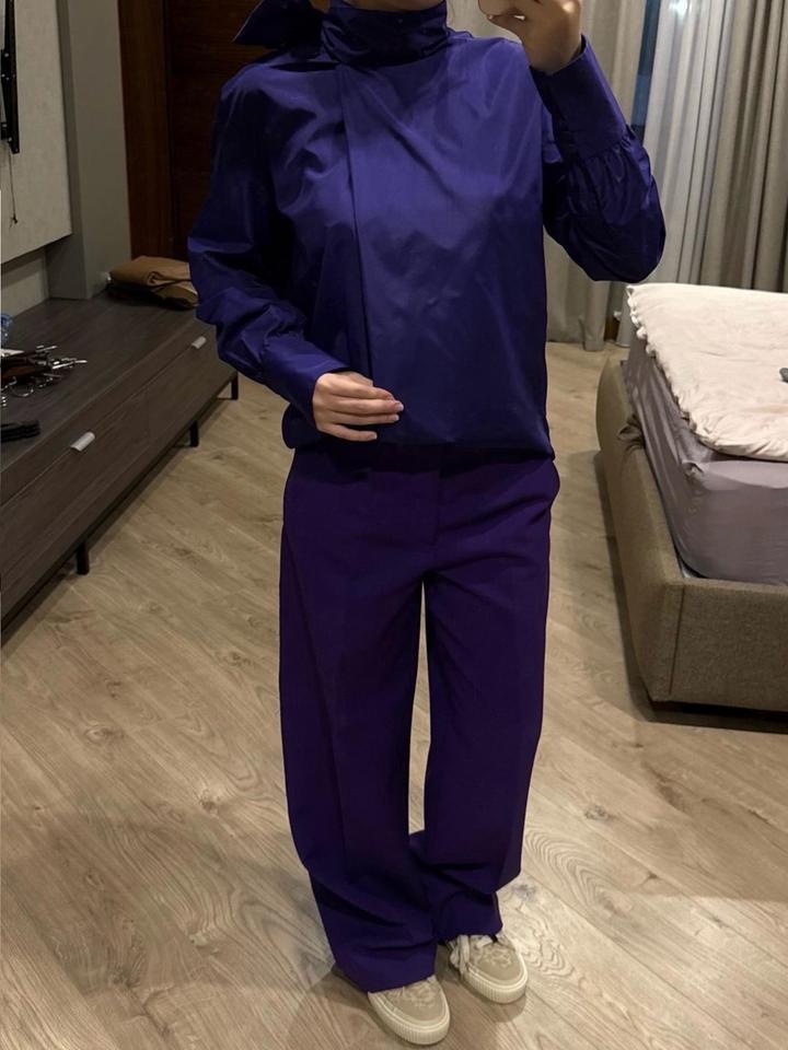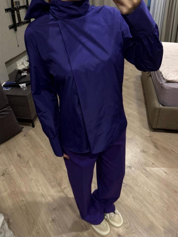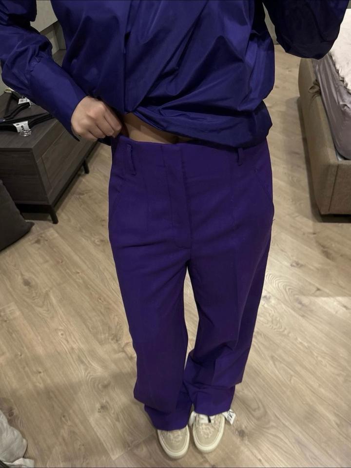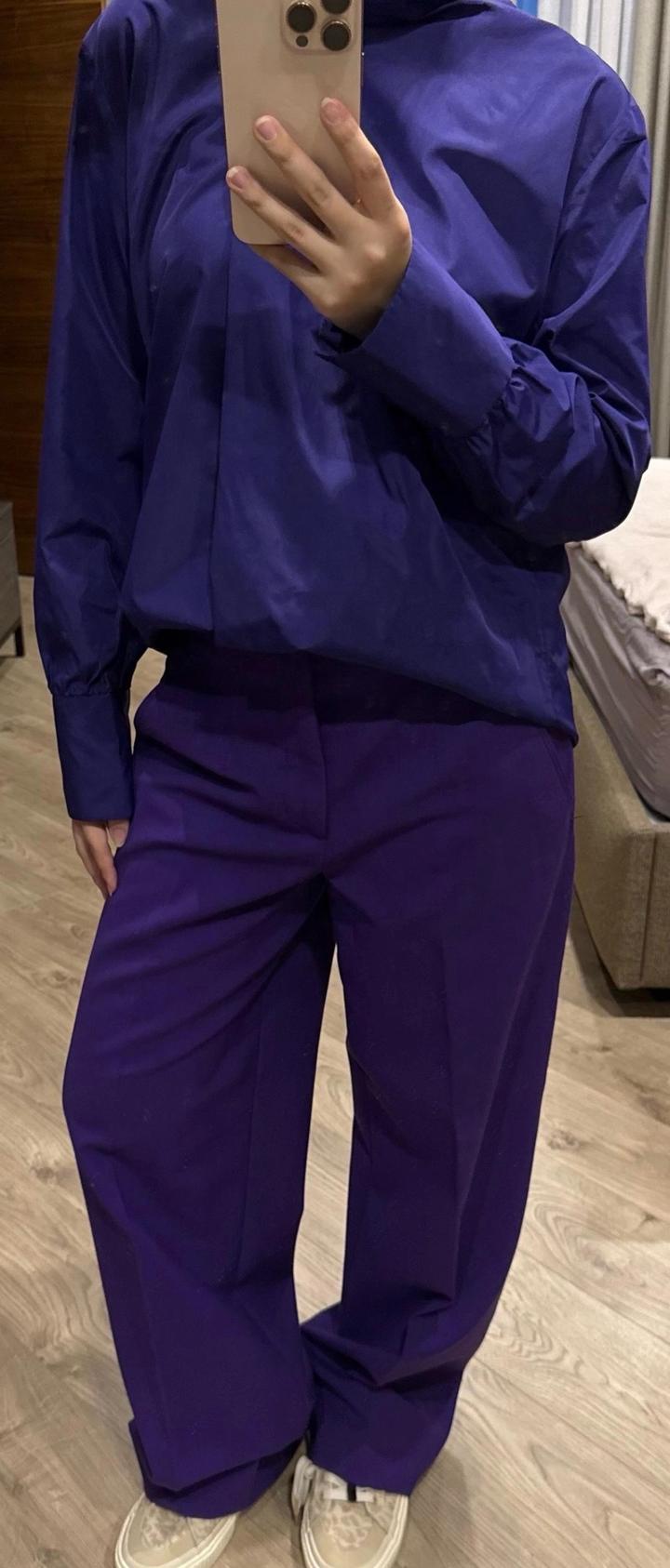 Комплект Zara в фиолетовом оттенке. Рубашка и брюки размера М, новые без бирок. Отличный вариант на выход/ мероприятие и также можно сочетать с базовыми позициями по отделности, создавая акцентную вещь в образе. Артикул: 598661